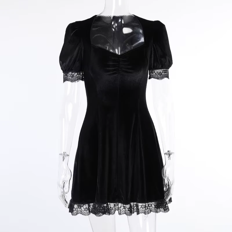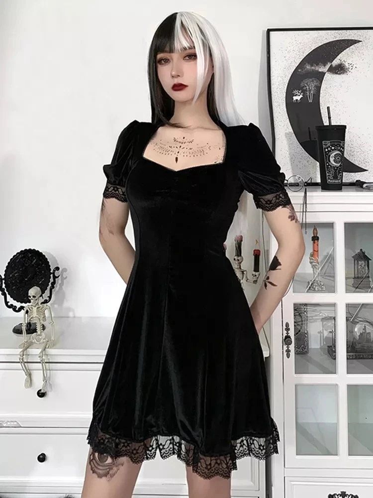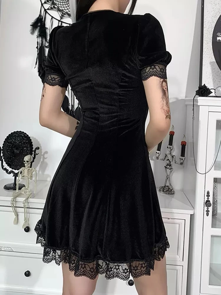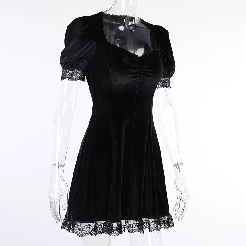 Czarna aksamitna sukienka, z koronką, gotycki styl