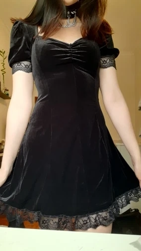 Aksamitna sukienka, w stylu gotyckim. Średniej długości, z koronkowymi obszyciami.
