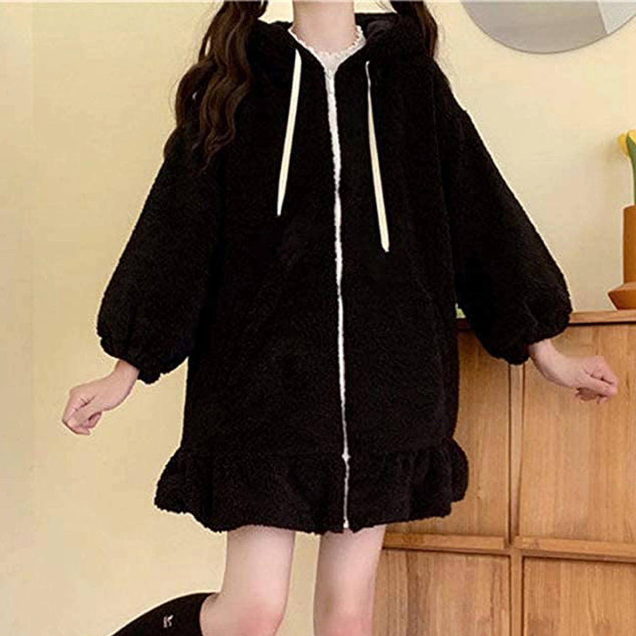 Damska bluza, kaptur z uszami królika - czarnyDamska bluza z kapturem w stylu królika to doskonała propozycja dla kobiet ceniących oryginalność i wygodę. Uroczy design z pluszowymi uszami królika na kapturze nadaje jej niepowtarzalnego charakteru, sprawiając, że wyróżnisz się w tłumie. Bluza wykonana z miękkiego, pluszowego materiału jest nie tylko przyjemna w dotyku, ale również doskonale chroni przed chłodem, co czyni ją idealnym wyborem na chłodniejsze dni. Luźny krój zapewnia pełen komfort noszenia, a delikatne falbanki dodają dziewczęcego uroku. | ![]() |