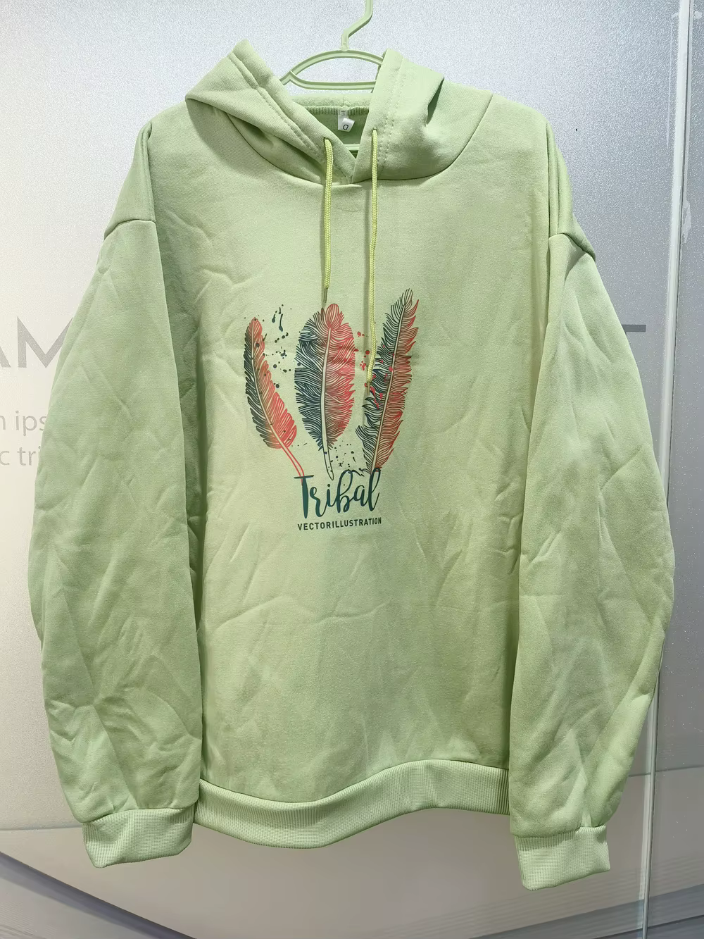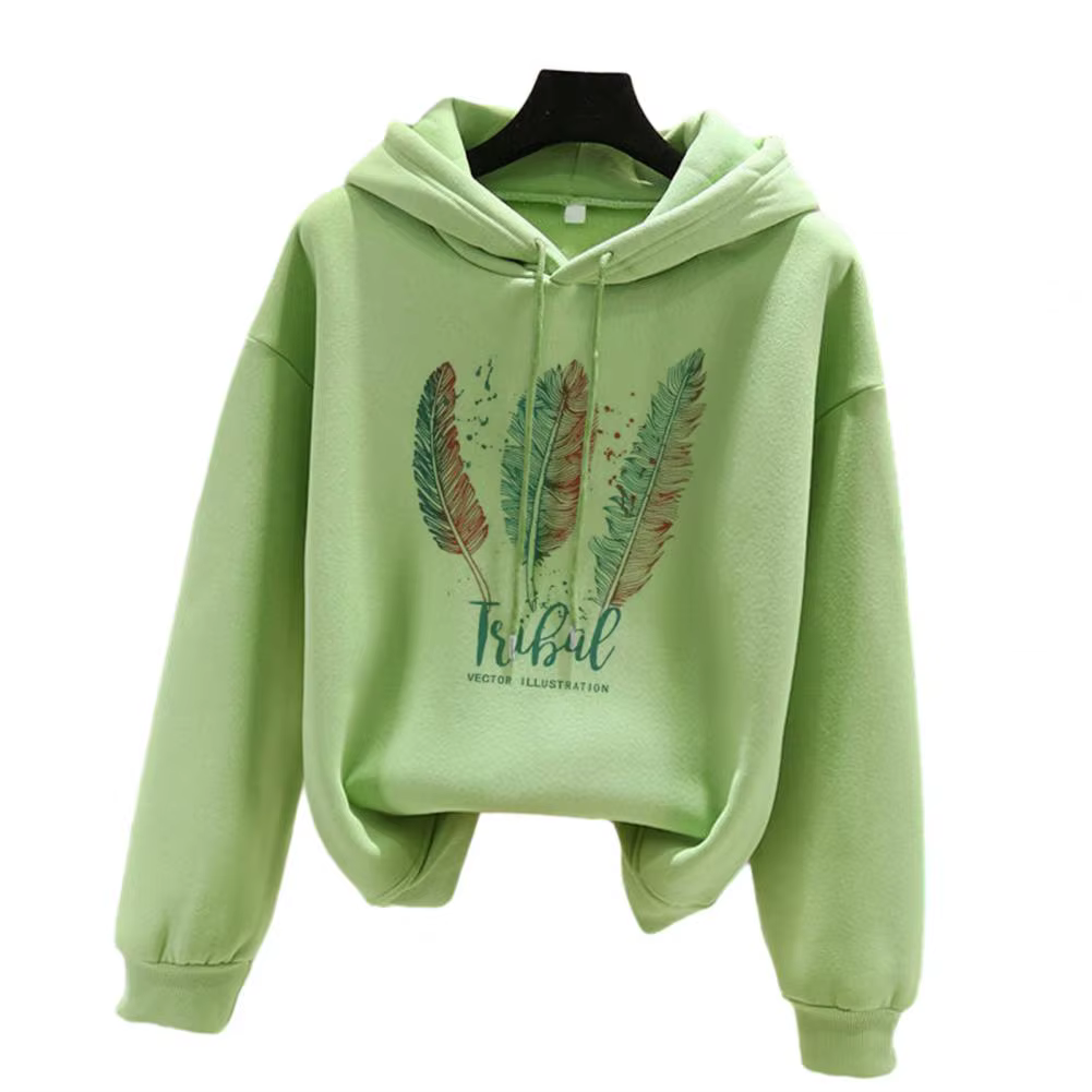 Damska bluza z kapturem - zielonaDamska bluza z nadrukiem piór to doskonały wybór dla kobiet ceniących styl i wygodę. Bluza wyposażona w kaptur oraz miękkie ściągacze przy mankietach i na dole, idealnie sprawdzi się w codziennych stylizacjach. Delikatny nadruk piór z napisem „Tribal” nadaje jej modnego, artystycznego charakteru. Wykonana z miękkiego i przyjemnego w dotyku materiału, zapewnia komfort noszenia przez cały dzień. Bluza to must-have w każdej garderobie na chłodniejsze dni lub swobodne wyjścia. | ![]() |