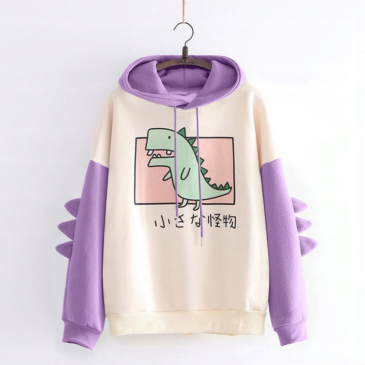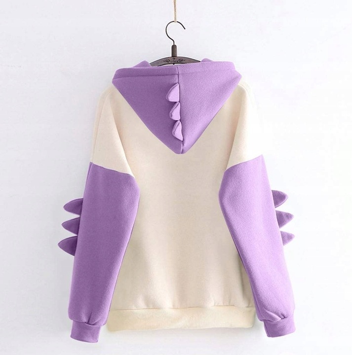 Bluza z kapturem z dinozaurem - fioletowe rękawyUrocza damska bluza z kapturem, która ozdobiona jest motywem z dinozaurem. Jest to idealna propozycja dla fanek oryginalnych i wygodnych ubrań. Bluza wykonana jest z miękkiego i przyjemnego materiału. Zapewnia komfort i ciepło, a stylowy kaptur i detale na rękawach w postaci kolców dinozaura - nadają niepowtarzalnego charakteru. | ![]() |