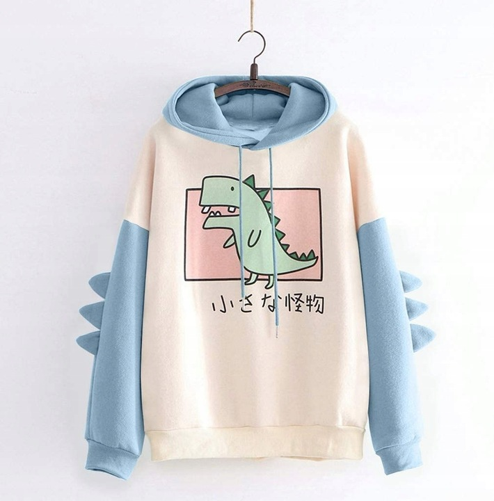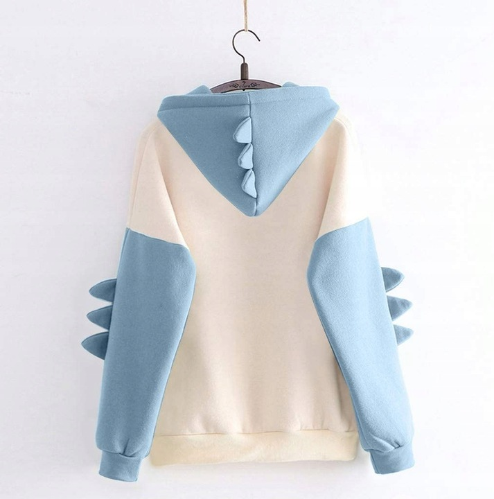 Bluza z kapturem z dinozaurem - niebieskie rękawyUrocza damska bluza z kapturem, która ozdobiona jest motywem z dinozaurem. Jest to idealna propozycja dla fanek oryginalnych i wygodnych ubrań. Bluza wykonana jest z miękkiego i przyjemnego materiału. Zapewnia komfort i ciepło, a stylowy kaptur i detale na rękawach w postaci kolców dinozaura - nadają niepowtarzalnego charakteru. | ![]() |