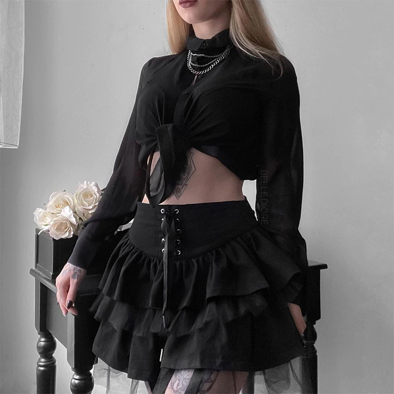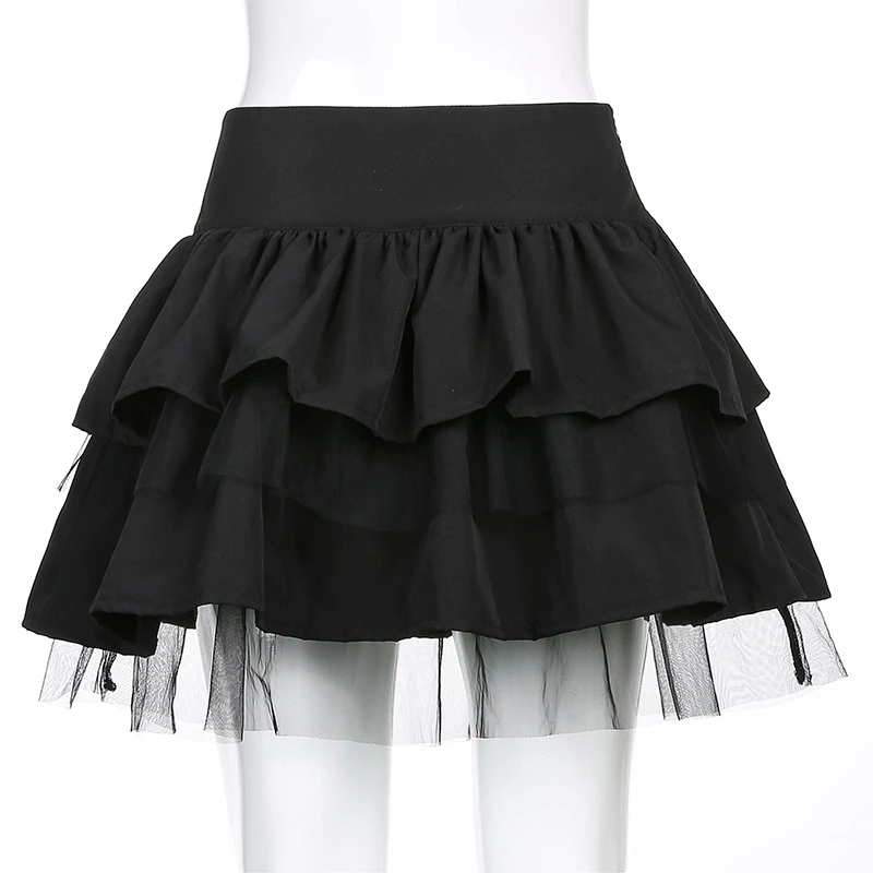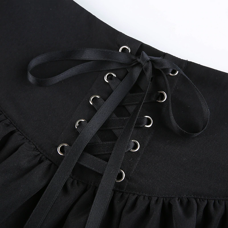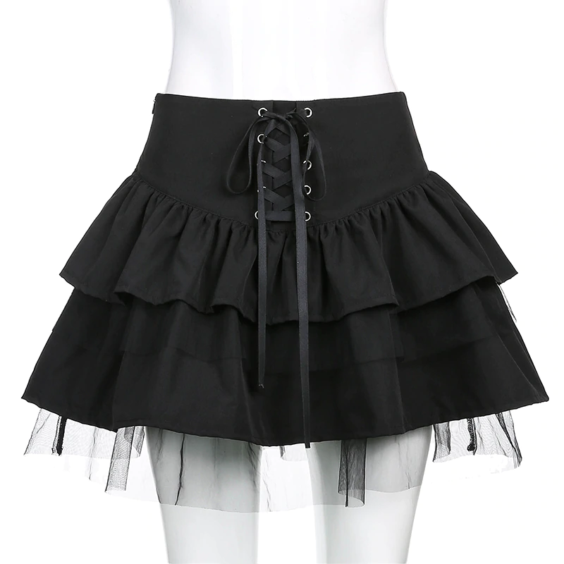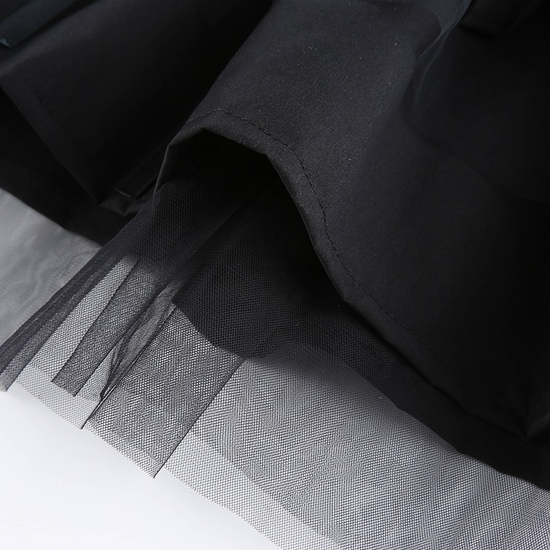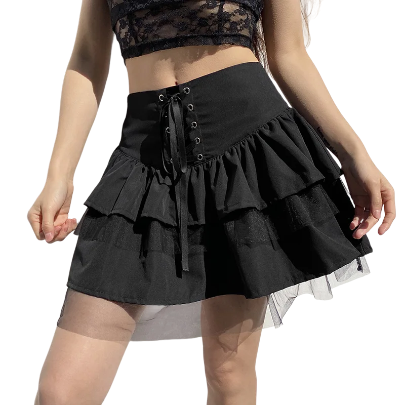 Spódnica z szerokim, wiązanym pasem. Liczne falbany dodają jej lekkości, a delikatna siatka i czarny kolor świetnie będą pasować do gotyckiego stylu.