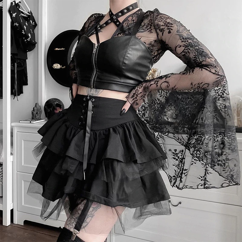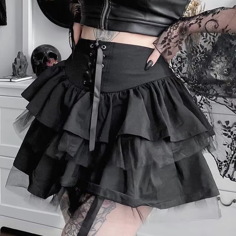Damska spódnica, motyw gotycki, z falbanami i wiązaniemTa damska spódnica gotycka z falbanami i ozdobnym wiązaniem w pasie to propozycja idealna dla kobiet pewnych siebie, które lubią wyróżniać się z tłumu. Doskonała na imprezy, koncerty, wieczorne wyjścia, a także jako nietuzinkowy element codziennych outfitów. Warstwowe falbany w połączeniu z subtelną siateczką nadają jej lekkości i wyjątkowego stylu, a wiązanie w talii pięknie podkreśla sylwetkę. To połączenie kobiecości, zmysłowości i odrobiny mrocznego klimatu. Spódnica świetnie sprawdzi się zarówno w stylizacji codziennej, jak i okazjonalnej - czy to na imprezę, czy na wyjście. Liczne wiązania oraz falbany dodają zmysłowości, a tiul nadaje odrobiny lekkości. Dlaczego warto kupić?