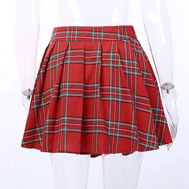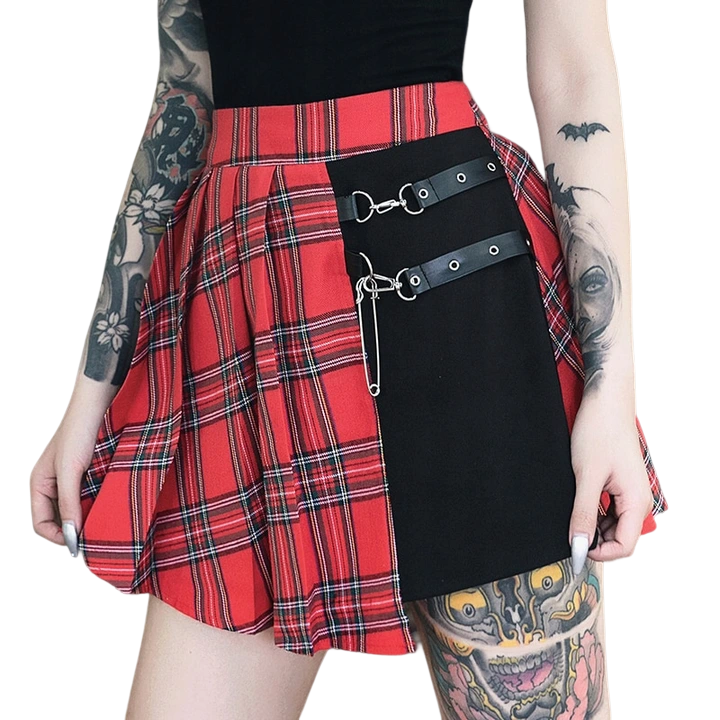 Damska spódnica w populary motyw kraty. Jest częściowo asymetryczna, z czarną wstawką, paskami i agrafką. Dobry wybór do punkrockowych stylizacji.