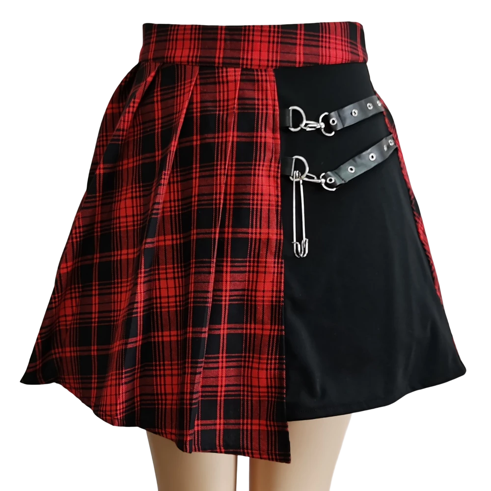 Damska spódnica w kratę, asymetryczna, z agrafką, rockowa