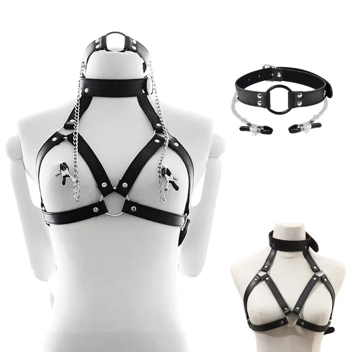 Damska uprząż na klatkę piersiową, z klipsami i otwartym kneblem, bdsm