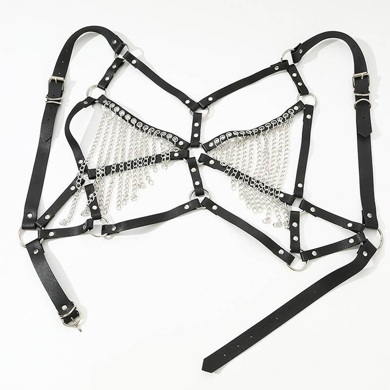 Damska uprząż na klatkę piersiową. Kształt uprzęży i załączone łańcuszki są efektowne. Idealnie sprawdzi się jako dodatek do stroju na imprezę czy sesję zdjęciową.