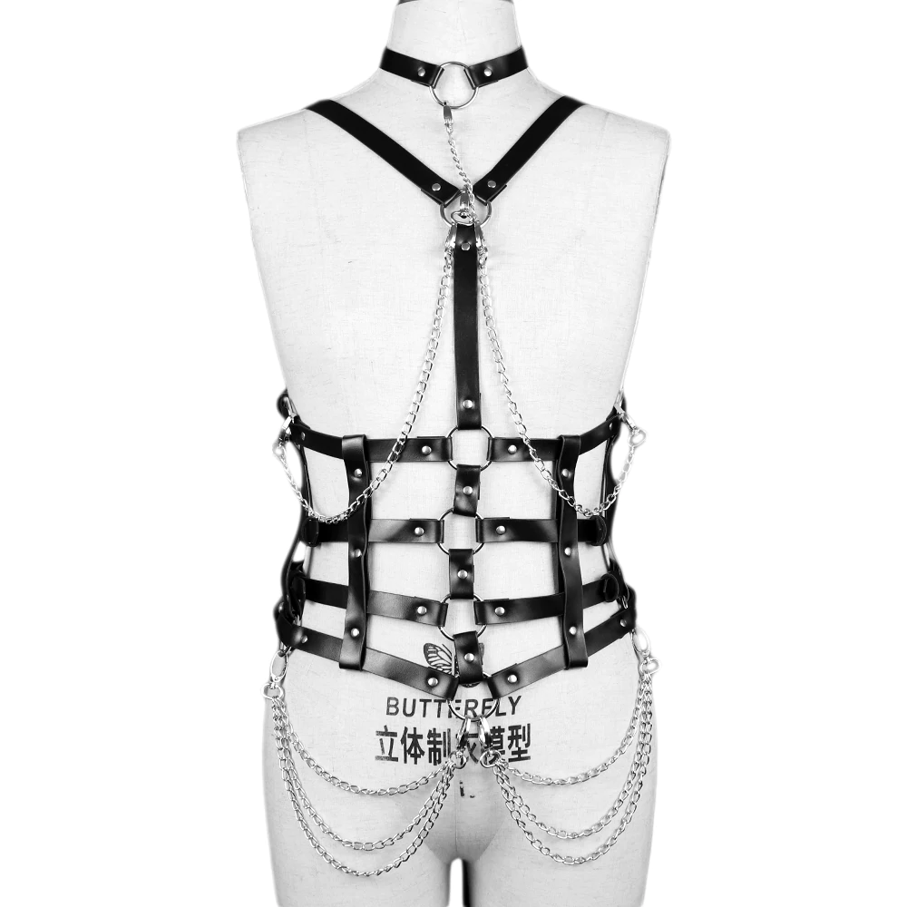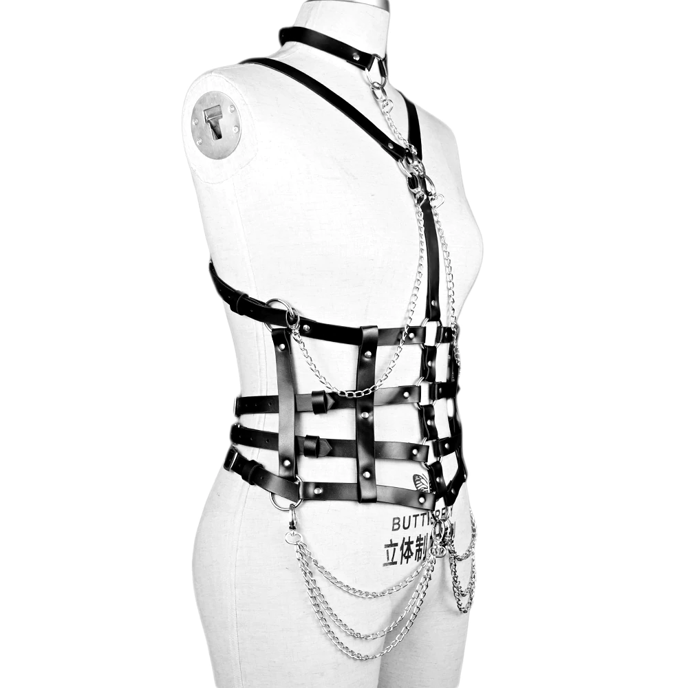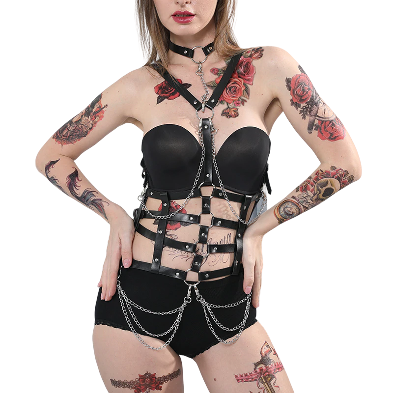 Damska uprząż z licznymi paskami i łańcuszkami stanowi idealną propozycję i dodatek do stylizacji.