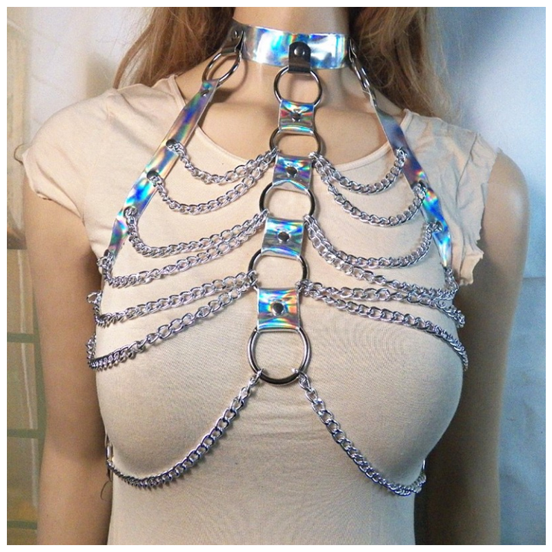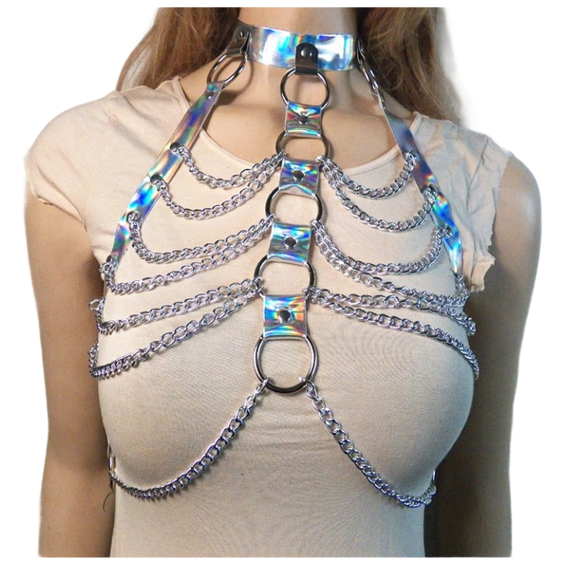 Damska uprząż, która posiada łańcuszki i paski z holograficznym wykończeniem - idealne na imprezę.