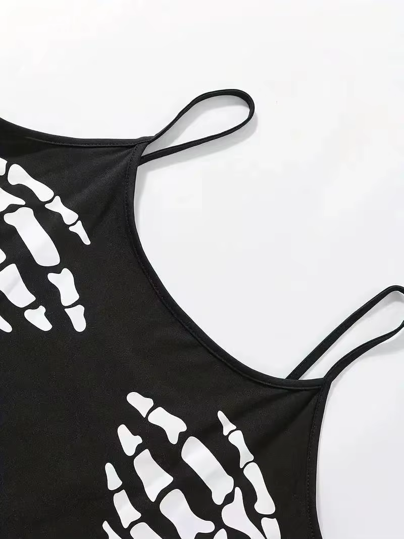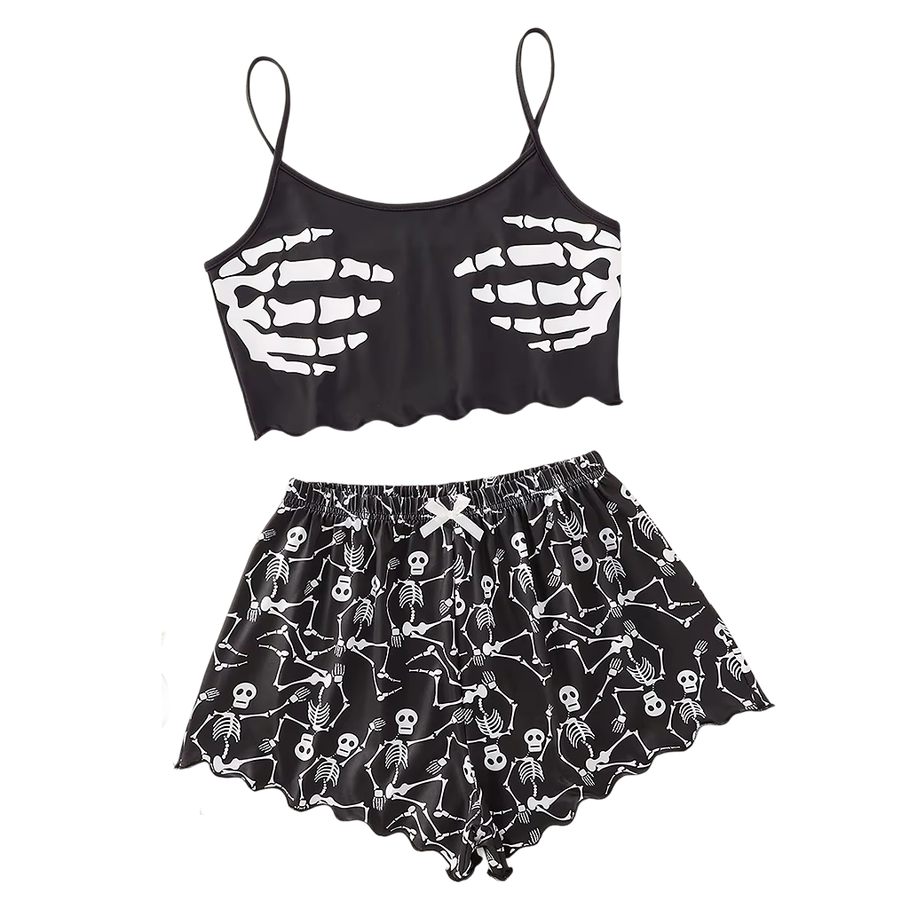 Damski komplet piżamy z nadrukiem szkieletówSzukasz piżamy, która wyróżni Cię z tłumu i doda Twoim wieczorom niepowtarzalnego klimatu? Ta damska piżama w czerni z zabawnym nadrukiem szkieletów to idealna propozycja dla kobiet, które lubią łączyć komfort z nietuzinkowym stylem. Uroczy top na ramiączkach z nadrukiem dłoni oraz krótkie spodenki w kościotrupy to zestaw, który sprawdzi się zarówno na leniwy wieczór w domu, jak i jako oryginalny prezent