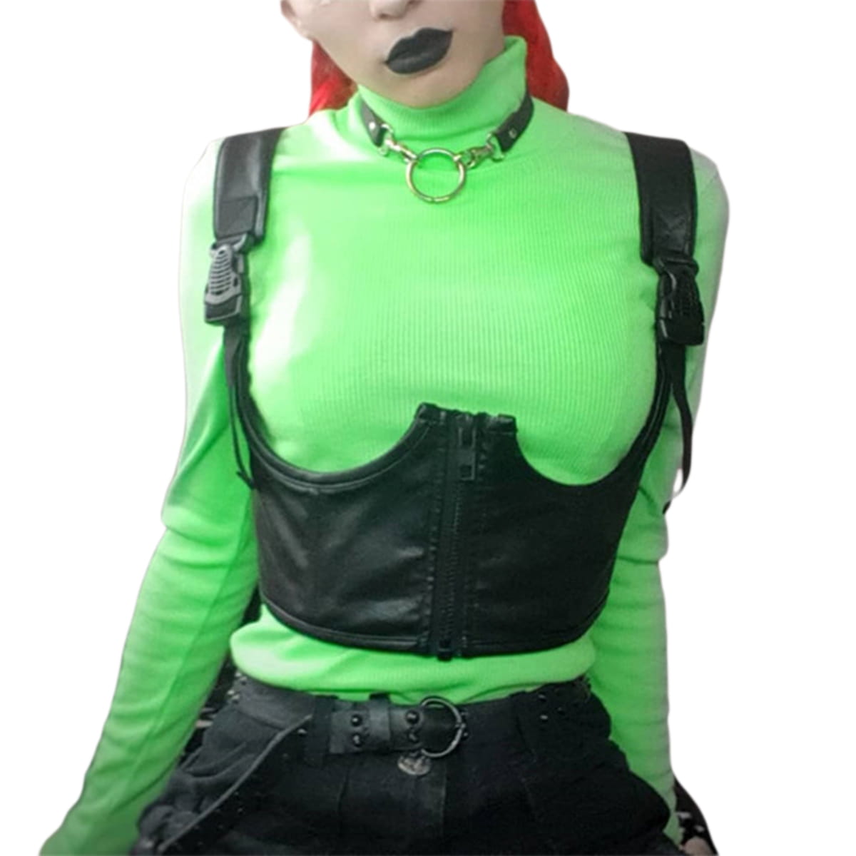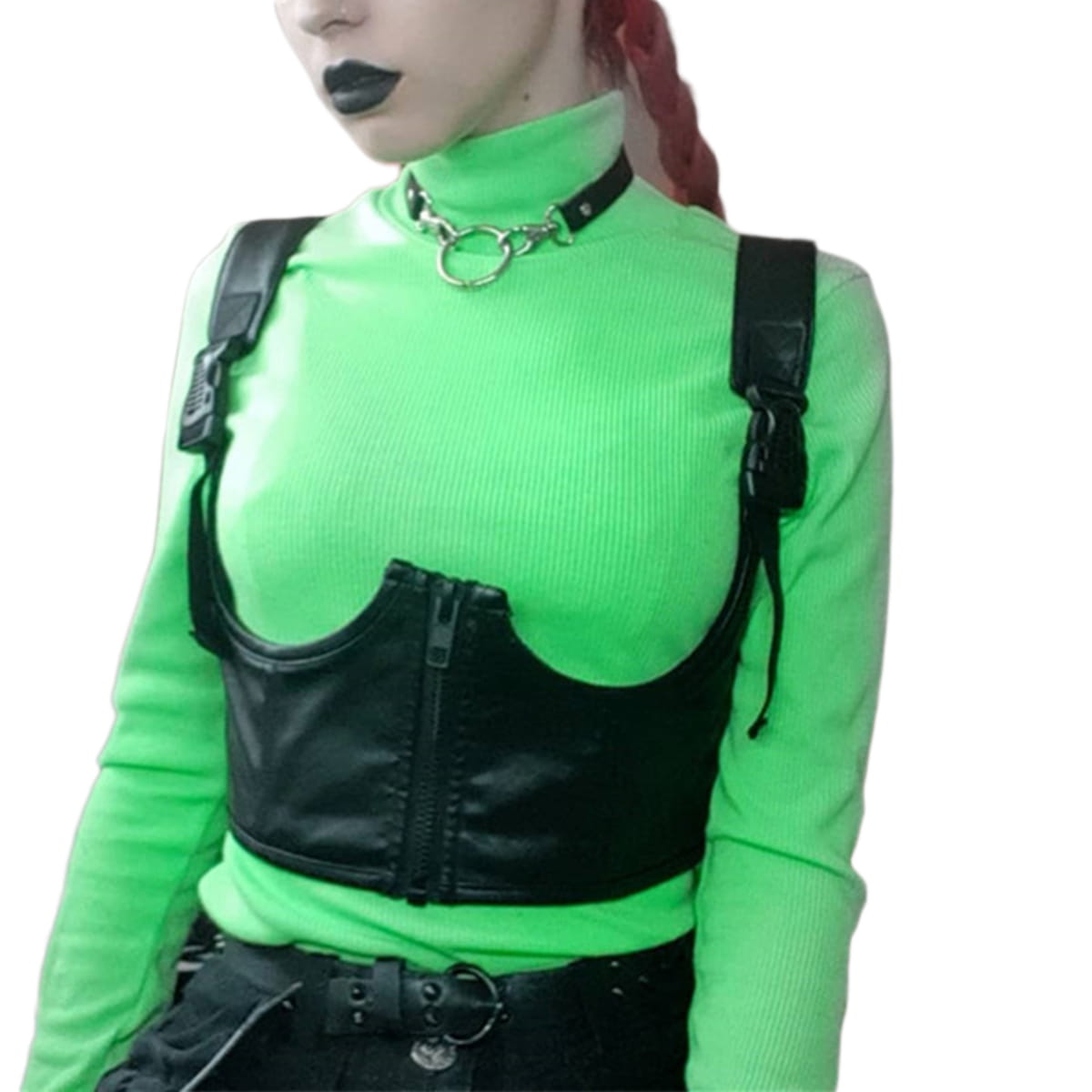 Damski, skórzany krótki top. Jest zapinany na zamek i ma regulowane ramiączka. Jest to gorset w typie underbust.