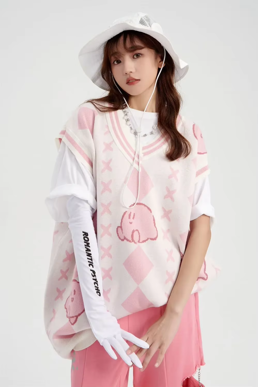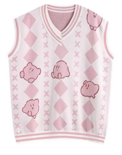 Damski sweter - motyw KirbyDamski sweter bez rękawów w delikatnych pastelowych kolorach z motywem Kirby to idealny wybór dla osób, które cenią sobie modne i nietuzinkowe ubrania. Klasyczny wzór rombów w połączeniu z uroczymi wizerunkami Kirby nadaje swetrowi niepowtarzalnego charakteru. Miękki materiał gwarantuje wygodę noszenia, a kontrastowe wykończenia podkreślają jego wyjątkowy styl. Doskonały do noszenia na co dzień, idealnie komponuje się z koszulkami i spódnicami, tworząc modny, warstwowy look. | ![]() |