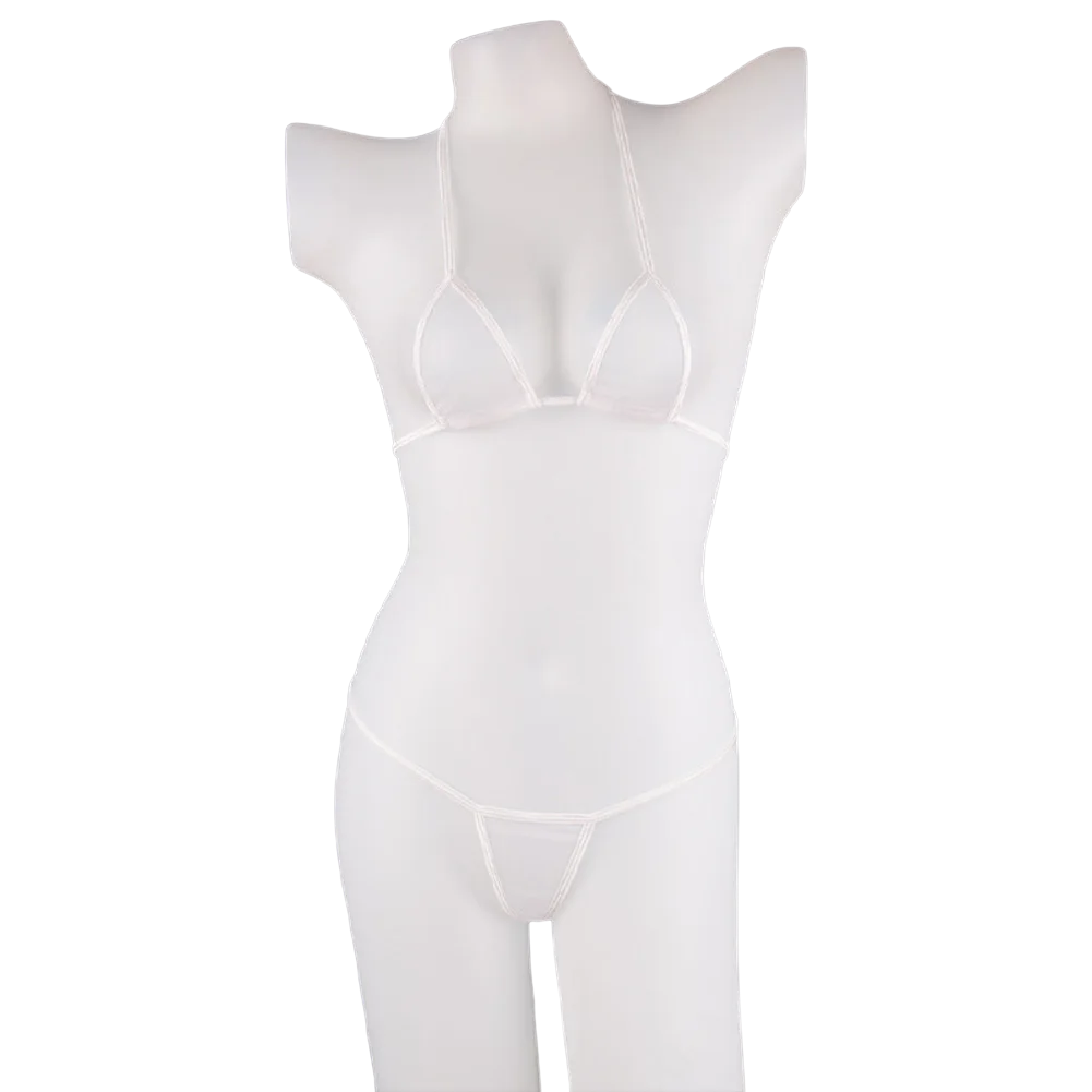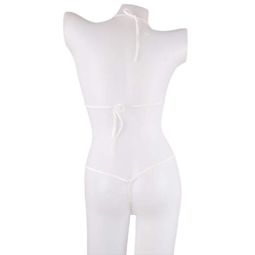 Damskie mikrobikini, które posiada wiązany biustonosz. Dwuczęściowy kostium jest prześwitujący.
