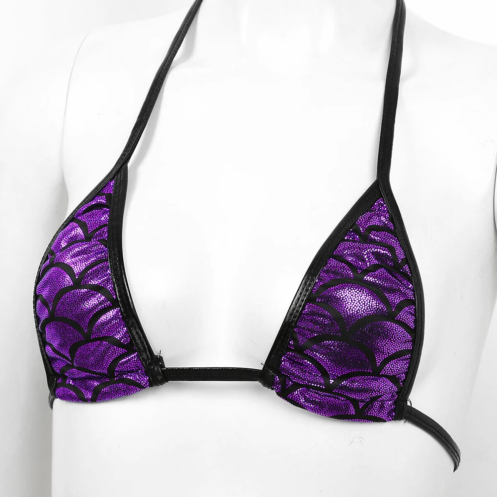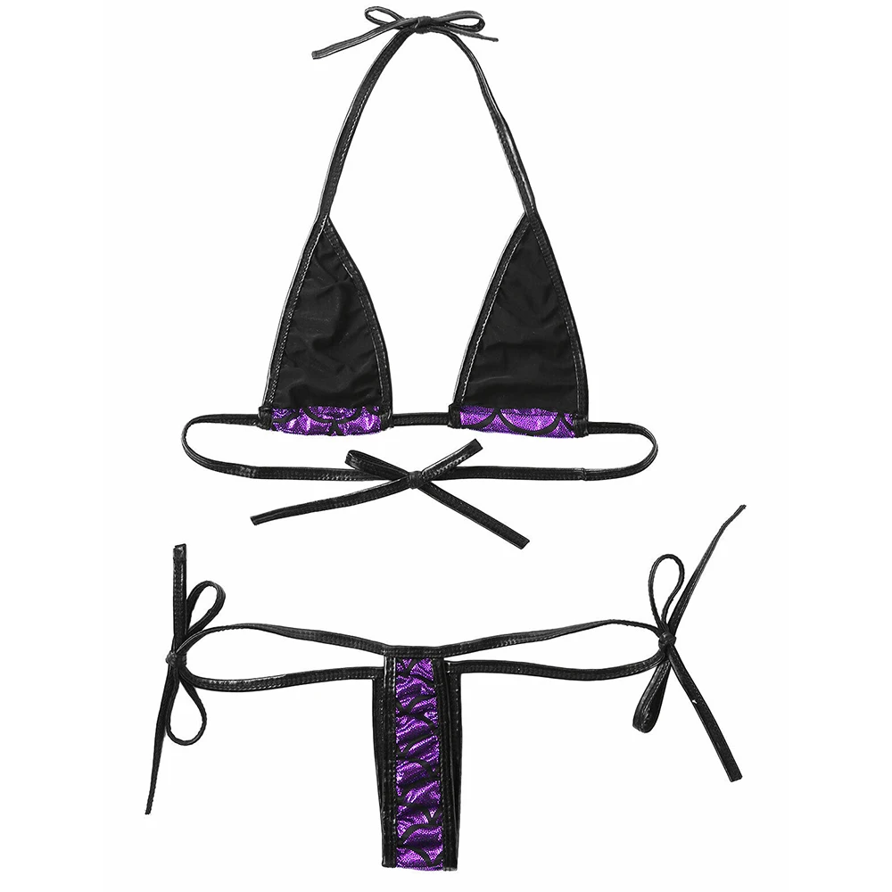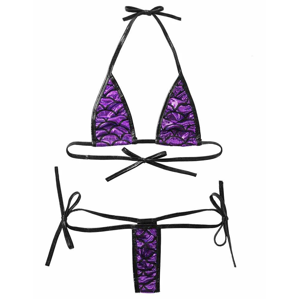 Damskie mikrobikini ze wzorem łusek. Zarówno górna, jak i dolna część bikini są wiązane.