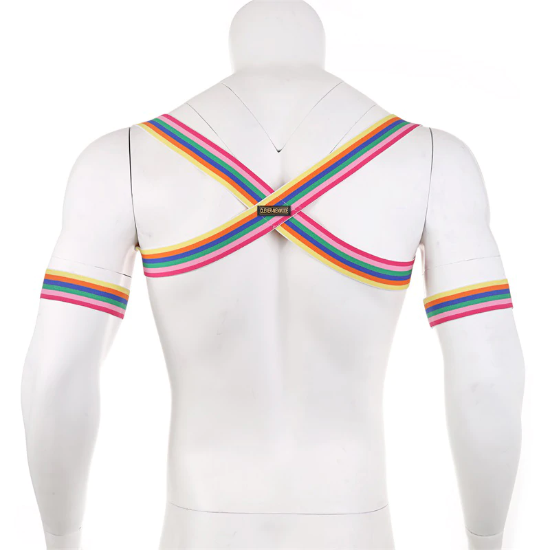 Męska uprząż w kolorach tęczy od to doskonały wybór dla odważnych, pewnych siebie mężczyzn, którzy lubią eksperymentować ze stylem i wyrażać siebie bez kompromisów.