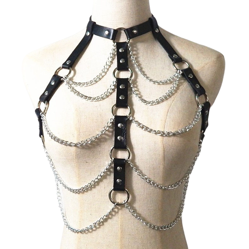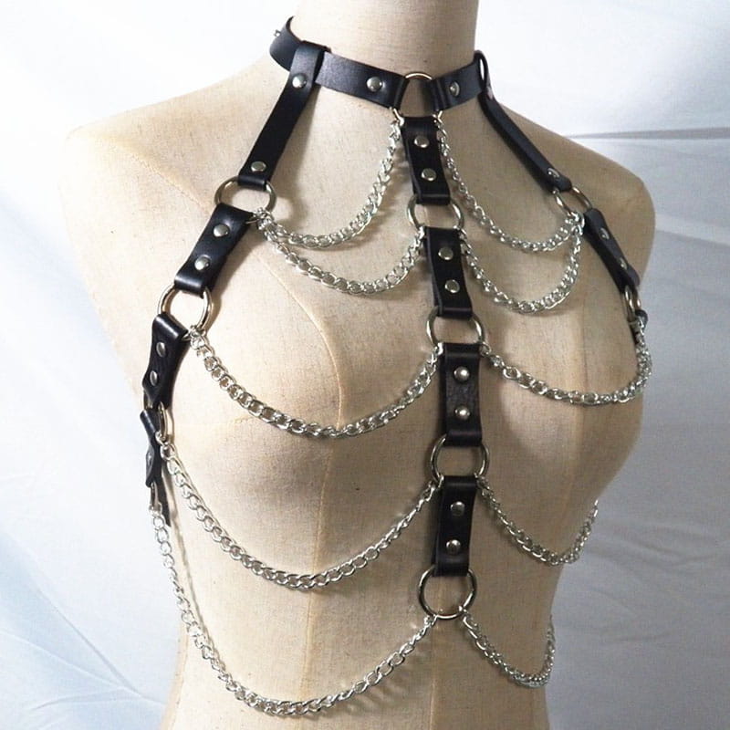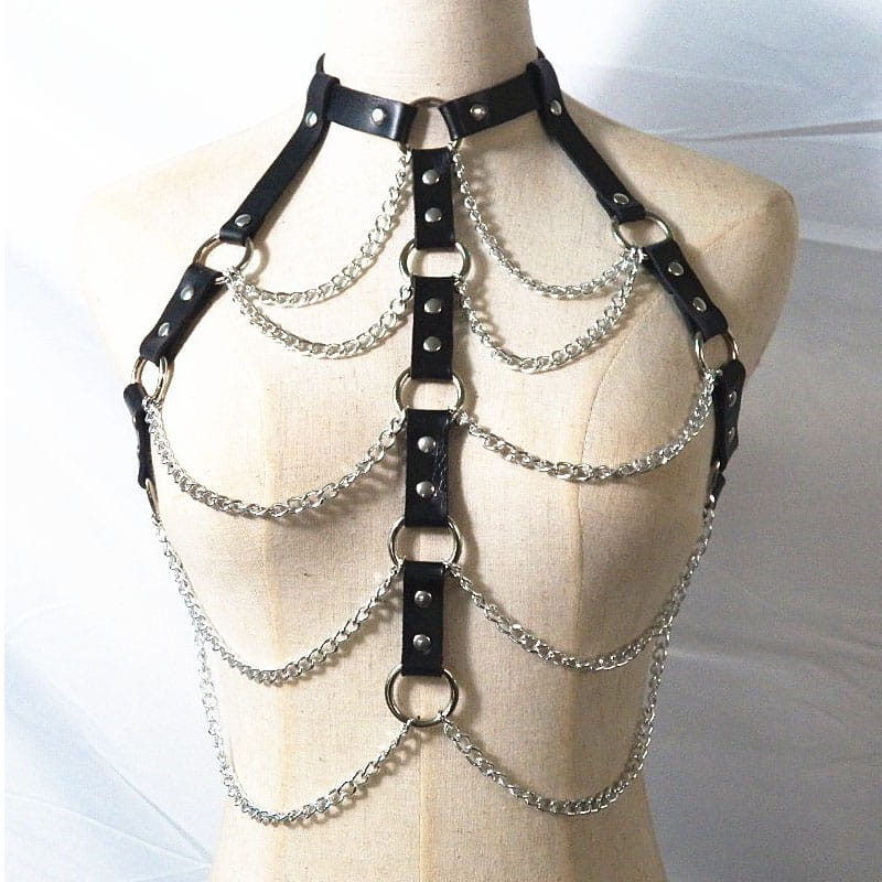 Damska uprząż z łańcuszkami może być ciekawym dodatkiem do imprezowej stylizacji czy stroju na potrzeby sesji zdjęciowej.