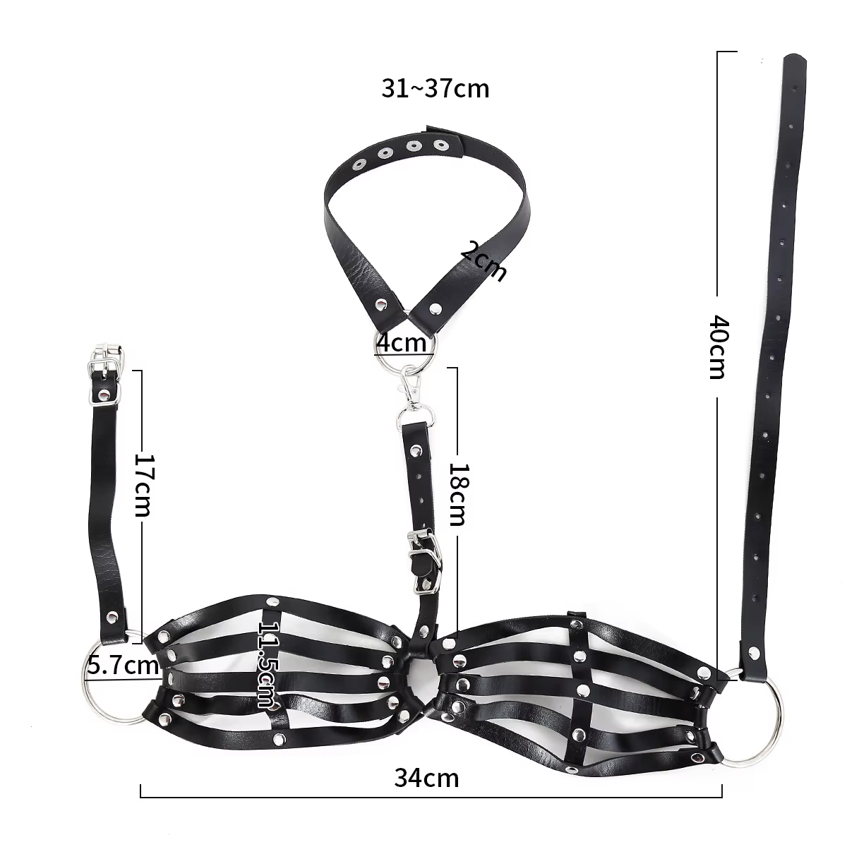 Kobiecy biustonosz bardotka, z obrożą, BDSMErotyczny biustonosz bardotka z obrożą to propozycja dla kobiet, które nie boją się eksperymentować i pragną wyglądać intrygująco oraz uwodzicielsko. Otwarty design z pasków i metalowych okuć sprawia, że całość przyciąga wzrok i tworzy niepowtarzalny efekt. Idealny na romantyczne wieczory, sesje zdjęciowe czy odważne stylizacje klubowe. Drapieżny biustonosz składa się z miseczek utworzonych z pasków, które połączone są ze sobą nitami. Nie posiada ramiączek, ale utrzymywany jest na pasku ze sprzączką, który można przypiąć do regulowanej obroży.