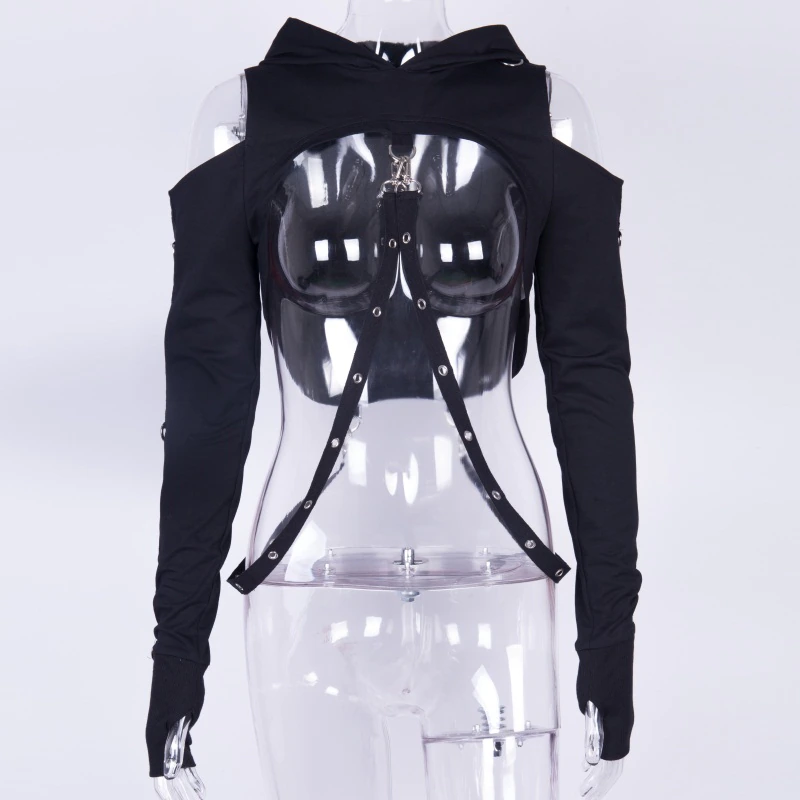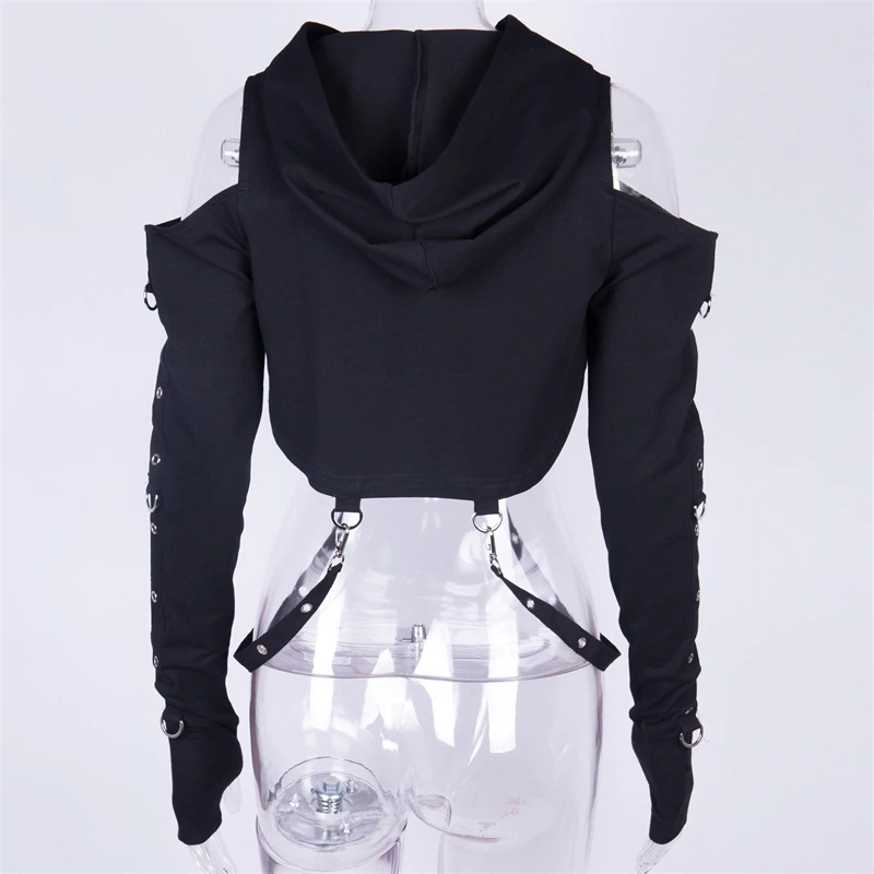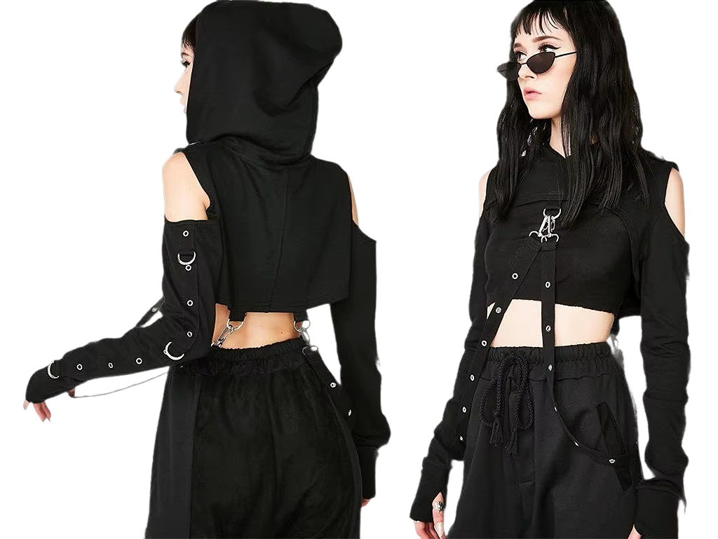 Nasza bluza to must-have dla miłośniczek stylu streetwear i gotyckiego. Dzięki ciekawym akcentom w postaci metalowych kółek i wycięć, stworzysz unikalny look, który wyróżni Cię w tłumie. Doskonale pasuje zarówno do spodni, jak i spódnic, tworząc pełny, modny zestaw. |
