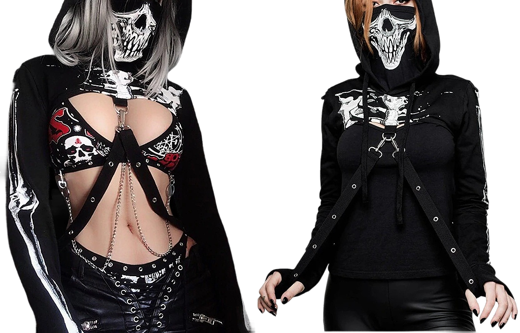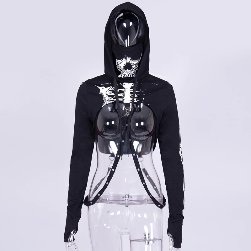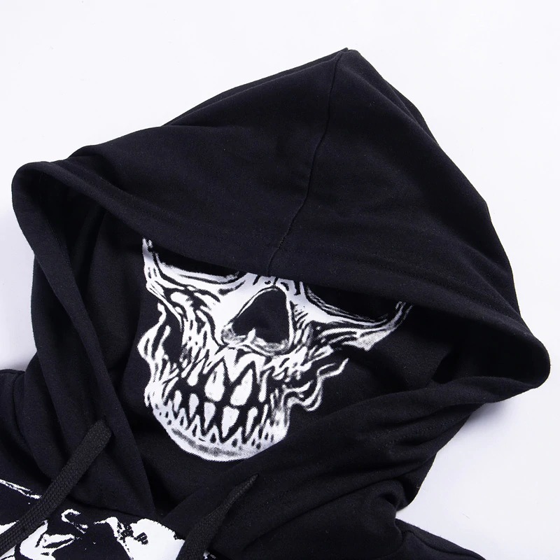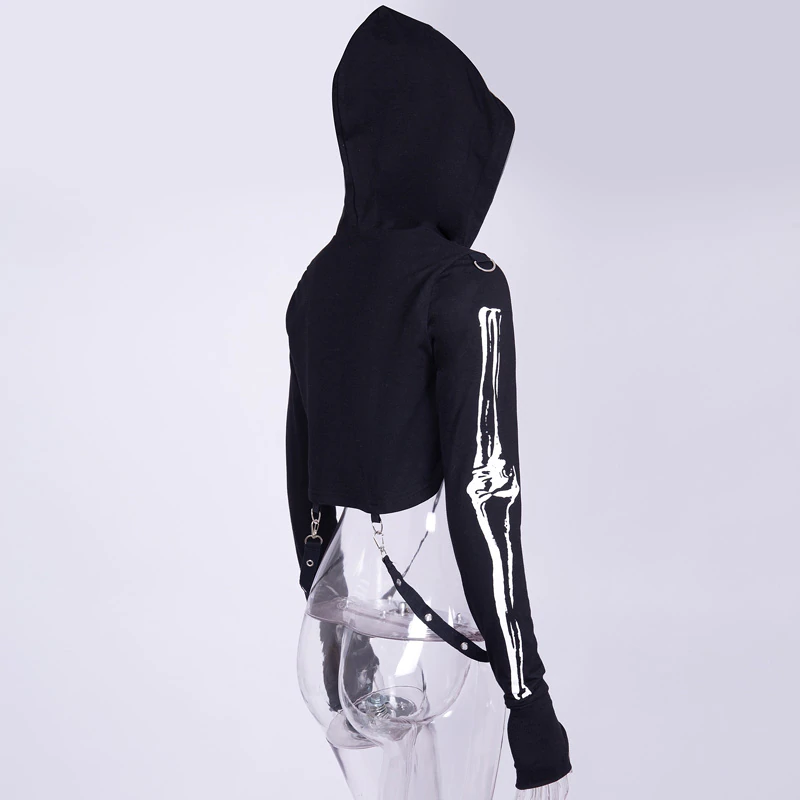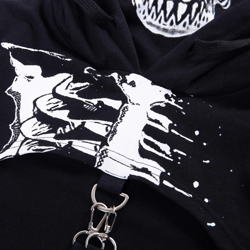 Krótka bluza z kapturem i kominem, motyw szkieletu - czarnaMroczna, a zarazem stylowa bluza z kapturem – połączenie mody ulicznej i alternatywnego stylu! Szukasz odzieży, która wyróżni Cię z tłumu i doda charakteru każdemu lookowi? Ta bluza to prawdziwy must-have! Dzięki wyrazistemu nadrukowi czaszki, nowoczesnym metalowym detalom oraz oryginalnym akcentom, jak regulowane paski z karabińczykami, ta bluza będzie idealnym wyborem na co dzień, koncerty czy imprezy tematyczne. | ![]() |
