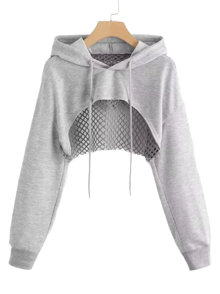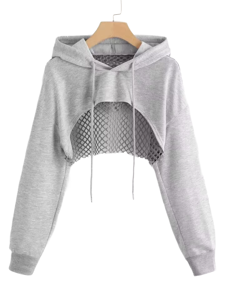 Krótka bluza z długimi rękawami, ze ściągaczami. Posiada kaptur i ozdobną siateczkę.