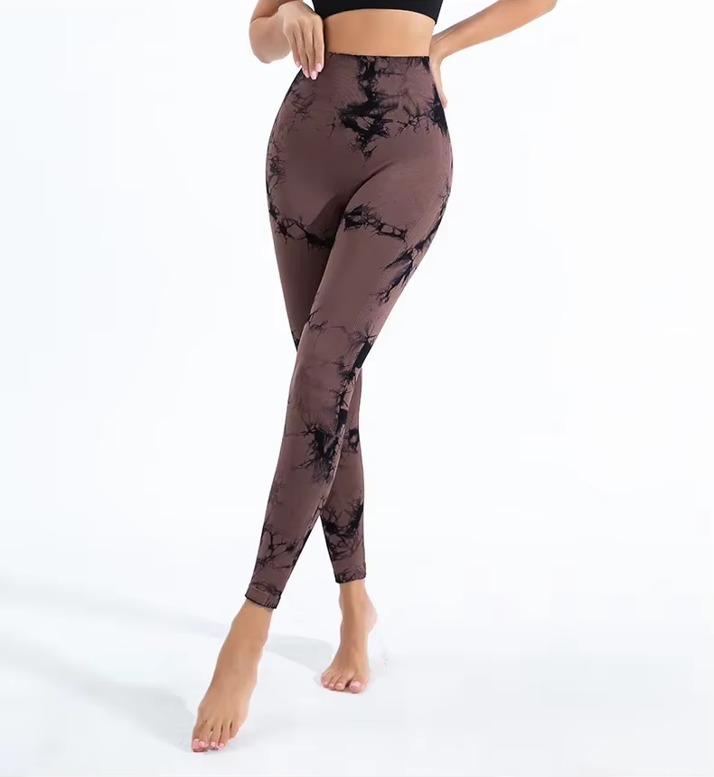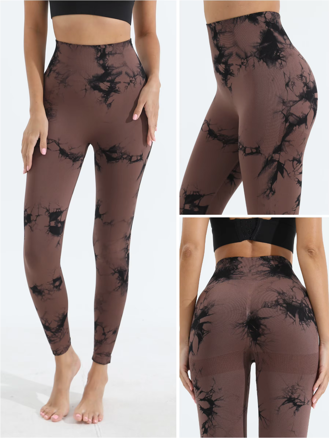 Legginsy damskie push up z wysokim stanem - brązowe tie-dye - na siłownię, fitness