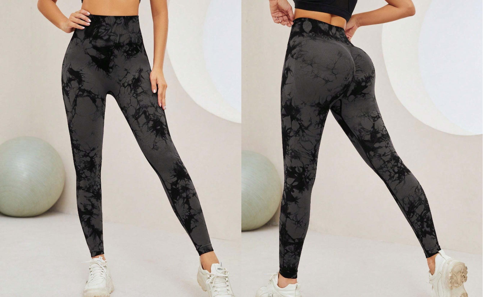 Legginsy damskie push up z wysokim stanem - czarne tie-dye - na siłownię, fitness
