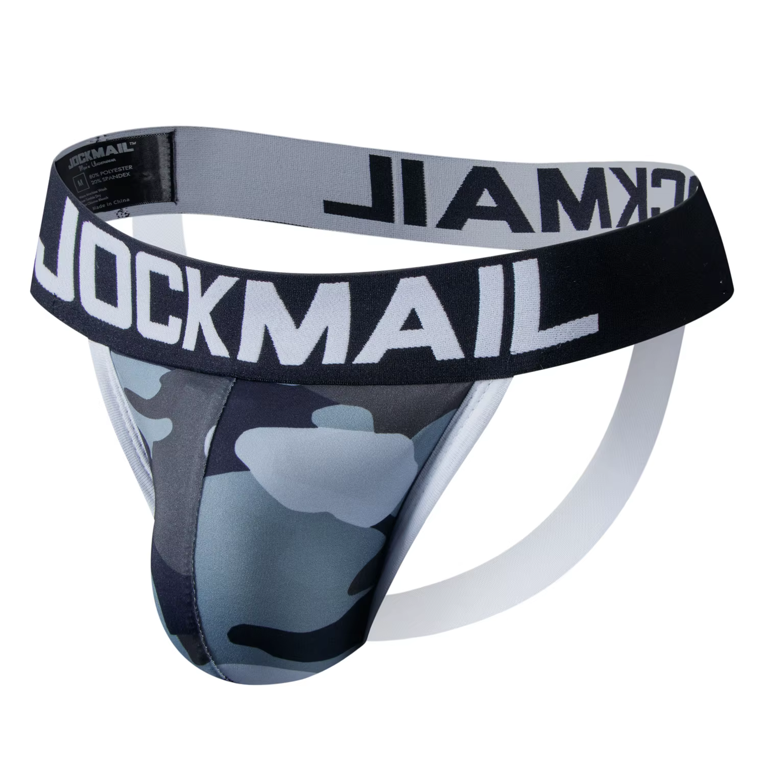 Jockstrapy w kolorystyce moro. Mają sportowy styl i szeroki elastyczny pas z napisem JOCKMAIL.