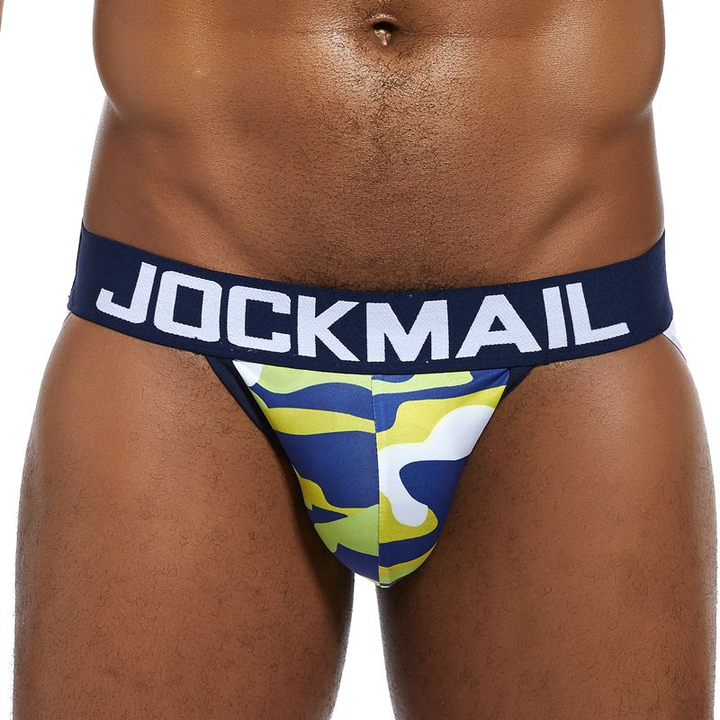 Jockstrapy w kolorystyce moro. Mają sportowy styl i szeroki elastyczny pas z napisem JOCKMAIL.
