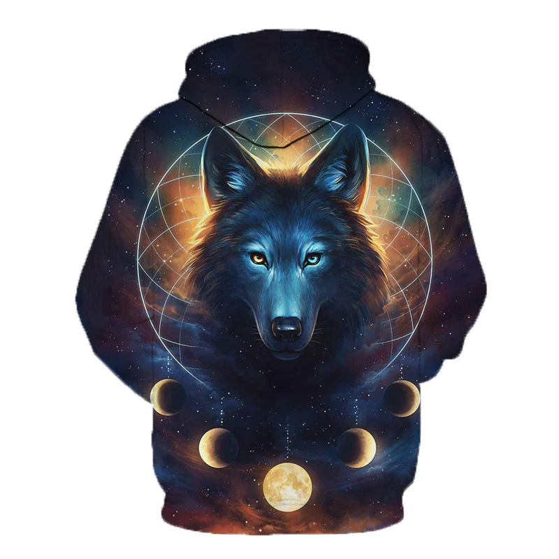Męska bluza z kapturem, motyw wilka i księżycaStylowa męska bluza z wyjątkowym motywem wilka i faz księżyca. Idealna na każdą okazję, bluza łączy nowoczesny design z tajemniczym motywem kosmicznego wilka. Ciemna kolorystyka dodaje jej elegancji, a grafika faz księżyca przyciąga uwagę, nadając unikalny charakter. Bluza została wykonana z miękkiego, oddychającego materiału, który zapewnia wygodę przez cały dzień. Posiada kaptur z regulowanym sznurkiem oraz praktyczną kieszeń kangurka. To idealny wybór na chłodniejsze dni, który łączy modę z komfortem. Zalety produktu