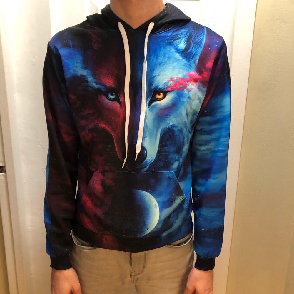 Męska bluza z kapturem, motyw wilkaOferujemy wyjątkową męską bluzę z kapturem, która wyróżnia się niebanalnym motywem wilka. To doskonały wybór dla mężczyzn ceniących sobie oryginalny wygląd i wygodę. Bluza wykonana jest z miękkiego, wysokiej jakości materiału, który zapewnia komfort noszenia przez cały dzień. Żywe kolory i precyzyjnie wykonany nadruk przyciągają wzrok, podkreślając nowoczesny styl użytkownika. Idealna na chłodniejsze dni, bluza z kapturem świetnie sprawdzi się zarówno na co dzień, jak i podczas wypadów na zewnątrz. Luźny krój i kieszeń kangurka dodają jej funkcjonalności, a stylowy motyw wilka i galaktyki zapewnia unikalny wygląd.