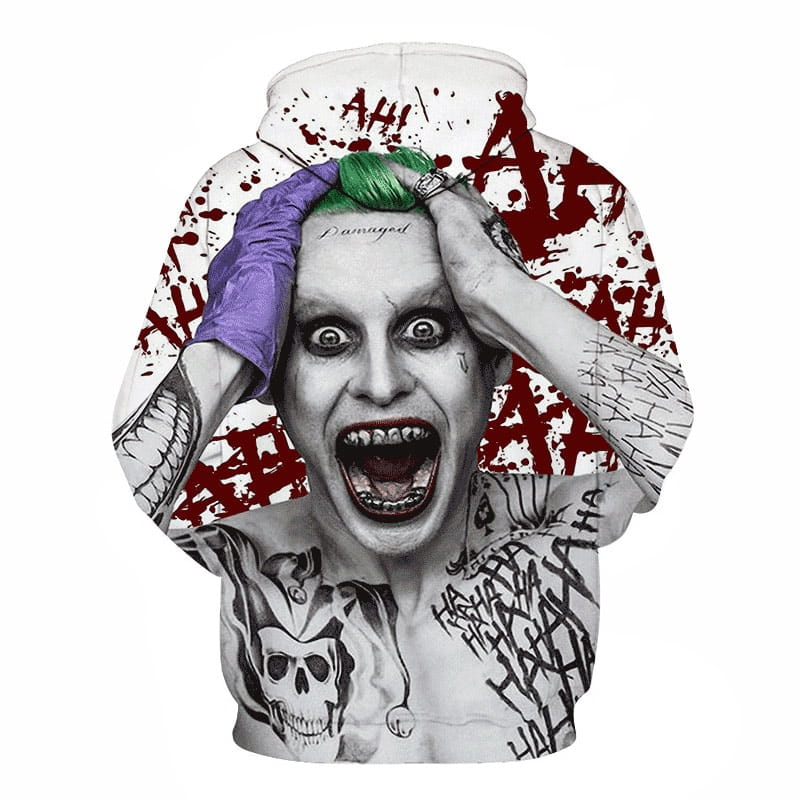 Męska bluza z kapturem, nadruk 3D - JokerPrezentujemy męską bluzę z kapturem z wyrazistym motywem, która wprowadza nieco szaleństwa i oryginalności do Twojej garderoby. Bluza wykonana jest z wysokiej jakości materiału, zapewniając komfort noszenia oraz trwałość. Wyrazisty nadruk i dynamiczny design przyciągają wzrok i dodają charakteru każdej stylizacji. Funkcjonalny kaptur oraz kieszeń kangurka zapewniają dodatkową wygodę, a luźny krój sprawia, że bluza doskonale sprawdza się zarówno na co dzień, jak i podczas chłodniejszych dni. Zalety produktu