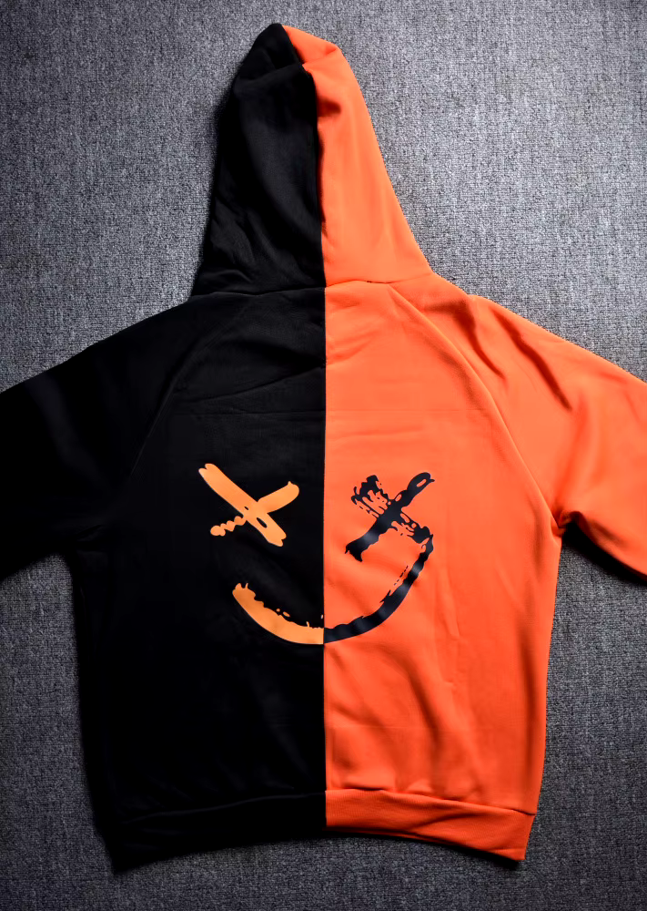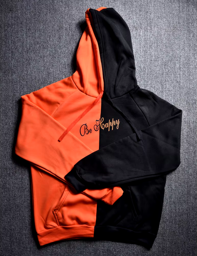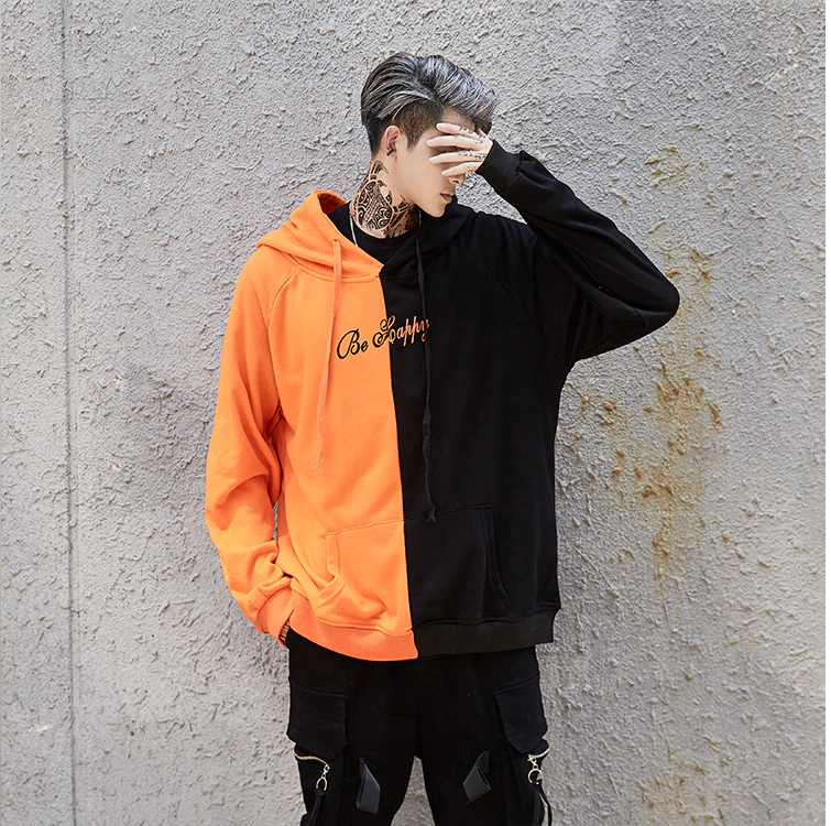 Męska bluza z kapturem, napis Be Happy - pomarańczowo-czarnaPrezentujemy męską dwukolorową bluzę z kapturem, która łączy w sobie nowoczesny design i maksymalny komfort. Bluza w kontrastowych kolorach czerni i pomarańczowego, ozdobiona z przodu napisem "Be Happy" oraz z tyłu grafiką uśmiechu z przekreślonymi oczami, to idealny wybór dla mężczyzn, którzy chcą wyróżnić się niebanalnym stylem. Wykonana z miękkiego, przyjemnego w dotyku materiału, zapewnia ciepło i wygodę na co dzień. Bluza jest idealna na chłodniejsze dni, a jej luźny krój i kaptur dodają jej funkcjonalności i modnego wyglądu. Kieszeń kangurka zapewnia dodatkową praktyczność, idealną do noszenia niezbędnych rzeczy lub do ogrzania rąk.