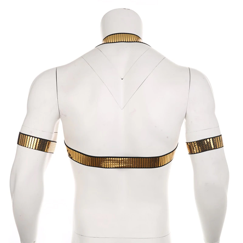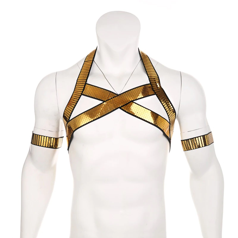 Męska uprząż, harness + 2 opaski, złote cekinyTen męski harness z połyskującymi złotymi cekinami to idealny wybór dla pewnych siebie mężczyzn, którzy chcą olśniewać na imprezach, w klubie czy podczas festiwali. To nie tylko odważny akcent modowy, ale też symbol wyjątkowego charakteru i energii! Zależy Ci na tym, aby zwrócić na siebie uwagę? Być gwiazdą imprezy albo podkreślić swój strój? Złota uprząż z cekinami, które odbijają światło to zdecydowanie będzie dobry wybór. Dwie dodatkowe opaski podkreślą ramiona. Dlaczego warto kupić?