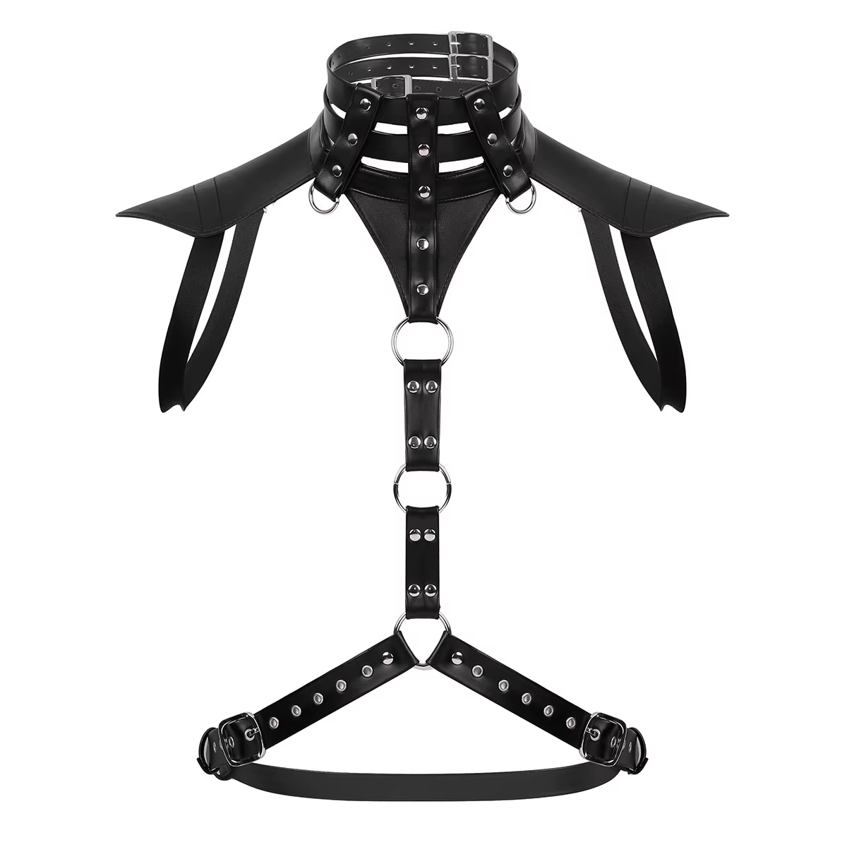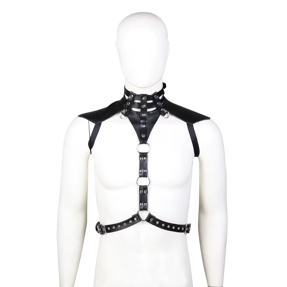 Uprząż na klatkę piersiową - z pagonami, obrożą z półkółkami i nitami - dla odważnego, pewnego siebie mężczyzny.