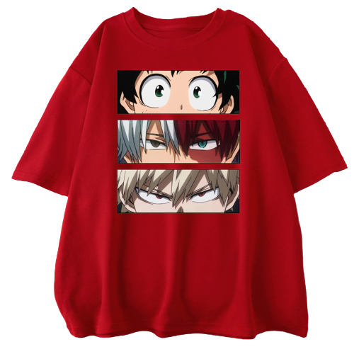 Męski T-shirt - My Hero Academia - czerwonyWyjątkowa koszulka z wyrazistym nadrukiem przedstawiającym oczy trzech bohaterów anime, idealna dla fanów tego gatunku. Wykonana z wysokiej jakości bawełny, zapewnia komfort noszenia przez cały dzień i doskonale sprawdza się w casualowych stylizacjach. Luźny, oversize'owy krój dodaje koszulce modnego, swobodnego charakteru, który wpisuje się w aktualne trendy. Intensywna barwa oraz nadruk sprawiają, że jest to doskonały wybór dla osób chcących wyrazić swoją pasję do anime. Zalety produktu