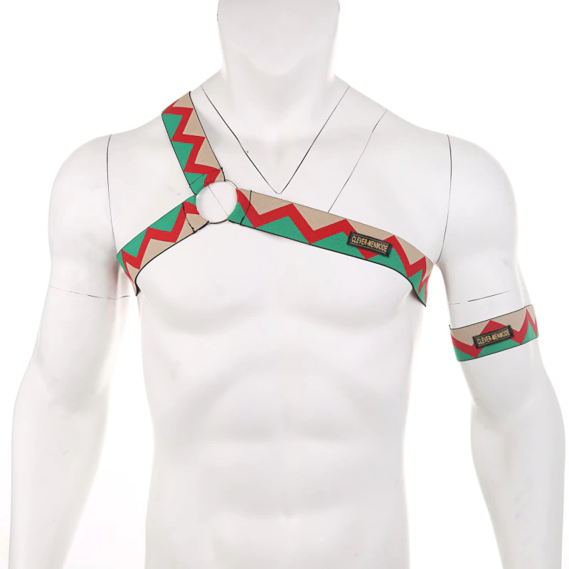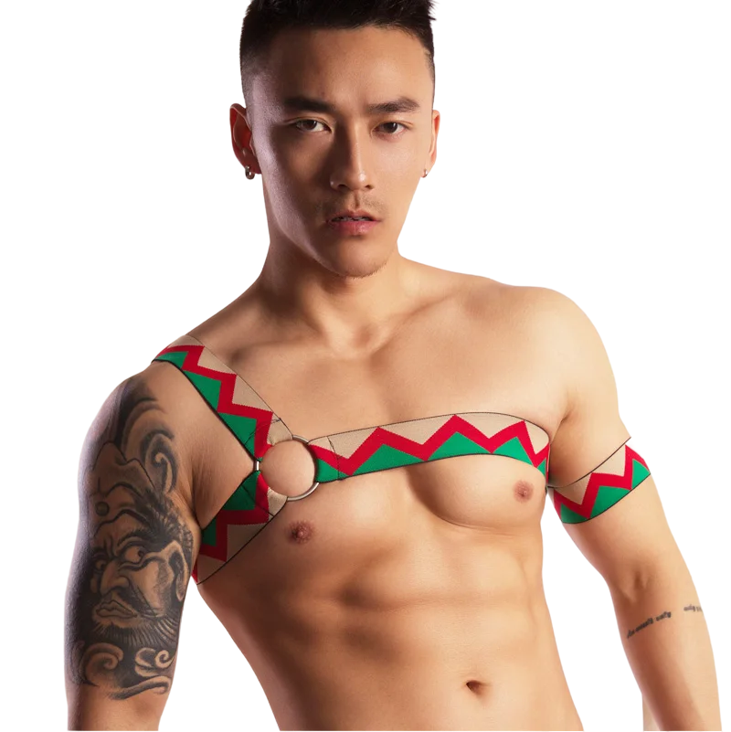 Dynamiczny, asymetryczny układ pasków z ozdobnym metalowym pierścieniem sprawia, że uprząż idealnie eksponuje ramiona i klatkę piersiową, a geometryczny, kolorowy wzór przyciąga uwagę i dodaje energii każdej stylizacji.