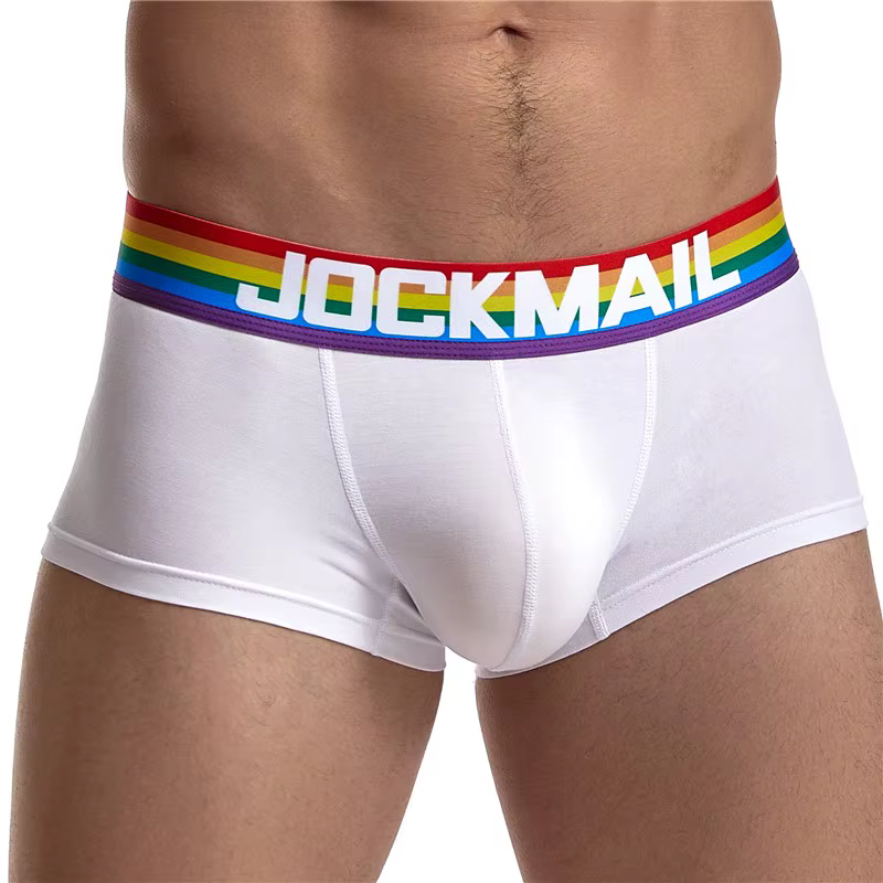 Męskie, bawełniane i dopasowane bokserki. Na elastycznym, tęczowym pasie jest napis JOCKMAIL.