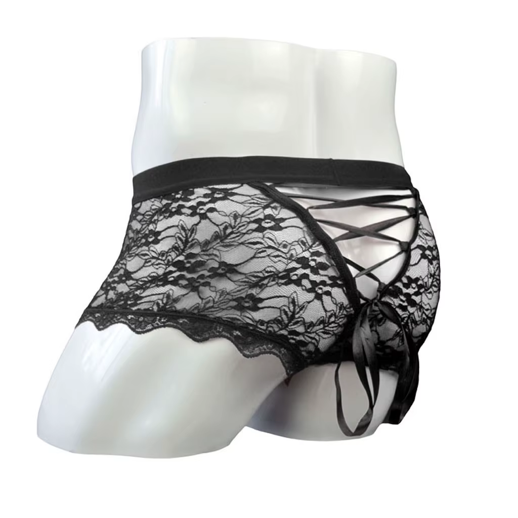 Męskie, koronkowe bokserki, z wiązaniemSzukasz bielizny, która łączy wygodę, zmysłowość i wyjątkowy wygląd? Te męskie bokserki z koronką i dekoracyjnym wiązaniem na pośladkach to idealny wybór dla mężczyzn, którzy chcą poczuć się pewnie, stylowo i niebanalnie. Transparentna koronka w połączeniu z subtelnym sznurowaniem dodaje im odważnego charakteru i sprawia, że stają się perfekcyjną propozycją zarówno na wyjątkowe chwile, jak i do noszenia na co dzień. Zdecydowanie jest to wybór dla odważnych mężczyzn, którzy chcą dodać zmysłowości do swojej stylizacji. Wiązanie koronkowych bokserek jest z tyłu.