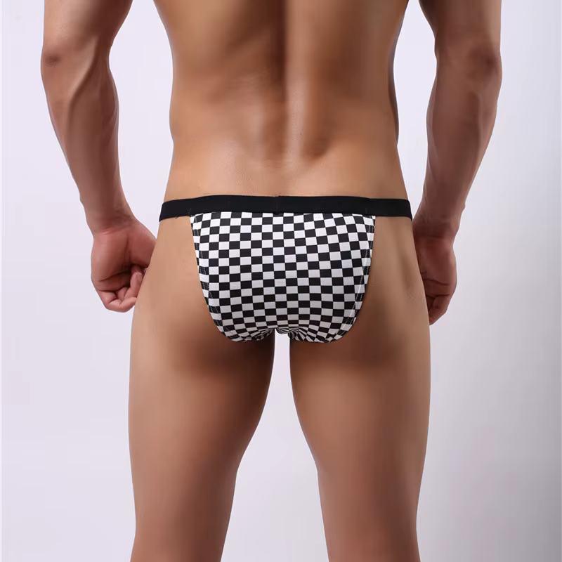 Męskie, skąpe tanga w kratkęSkąpe slipy w efektowny wzór szachownicy to idealna propozycja dla mężczyzn, którzy nie boją się wyróżniać. Minimalistyczny, dopasowany krój eksponuje atuty ciała i zapewnia zmysłowy wygląd – doskonały na wyjątkowe okazje i jako nietuzinkowa bielizna na co dzień. Skromne slipy, w typie tanga, które są na wąskim pasie. Materiał ma wzór w kratkę.