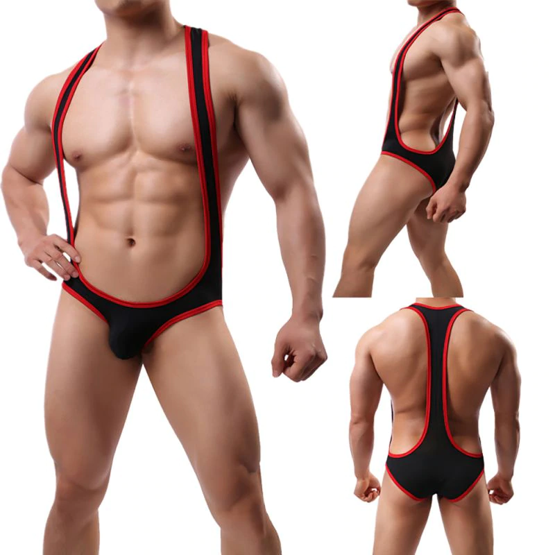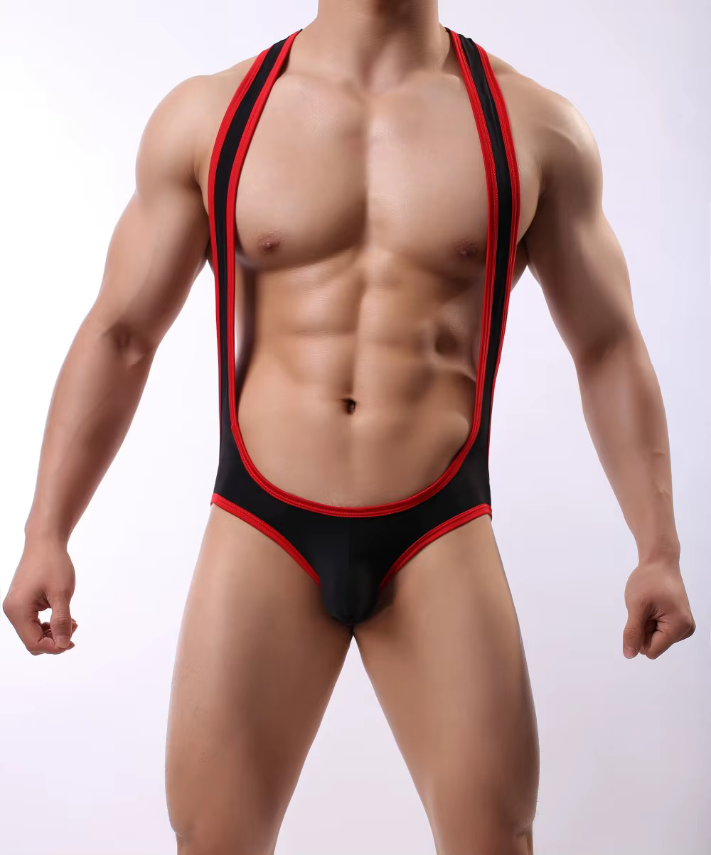 Męskie, sportowe body na szelkach, z wycięciemMęskie body w odważnym, sportowo-erotycznym stylu zostało stworzone z myślą o mężczyznach pewnych siebie, którzy lubią wyróżniać się swoim stylem. Głębokie wycięcia i dopasowany krój podkreślają sylwetkę, dodając jej dynamiki i zmysłowości. Idealne zarówno na intymne chwile, jak i jako nietypowy element garderoby na specjalne okazje. Męskie body, które jest dwukolorowe (baza i obszycie). Posiada głębokie wycięcie zarówno z przodu, jak i z tyłu; przez kształt materiału wygląda, jakby to były szelki. Zdecydowanie dla mężczyzn odważnych, którzy lubią sprawdzać coś nowego.
