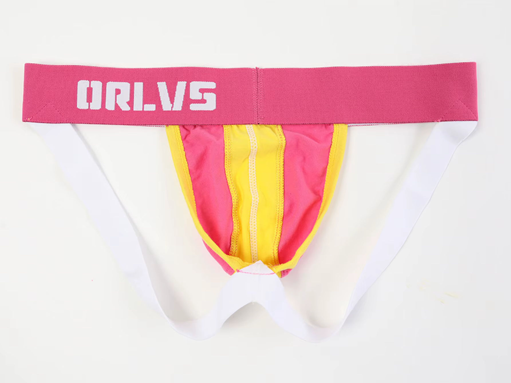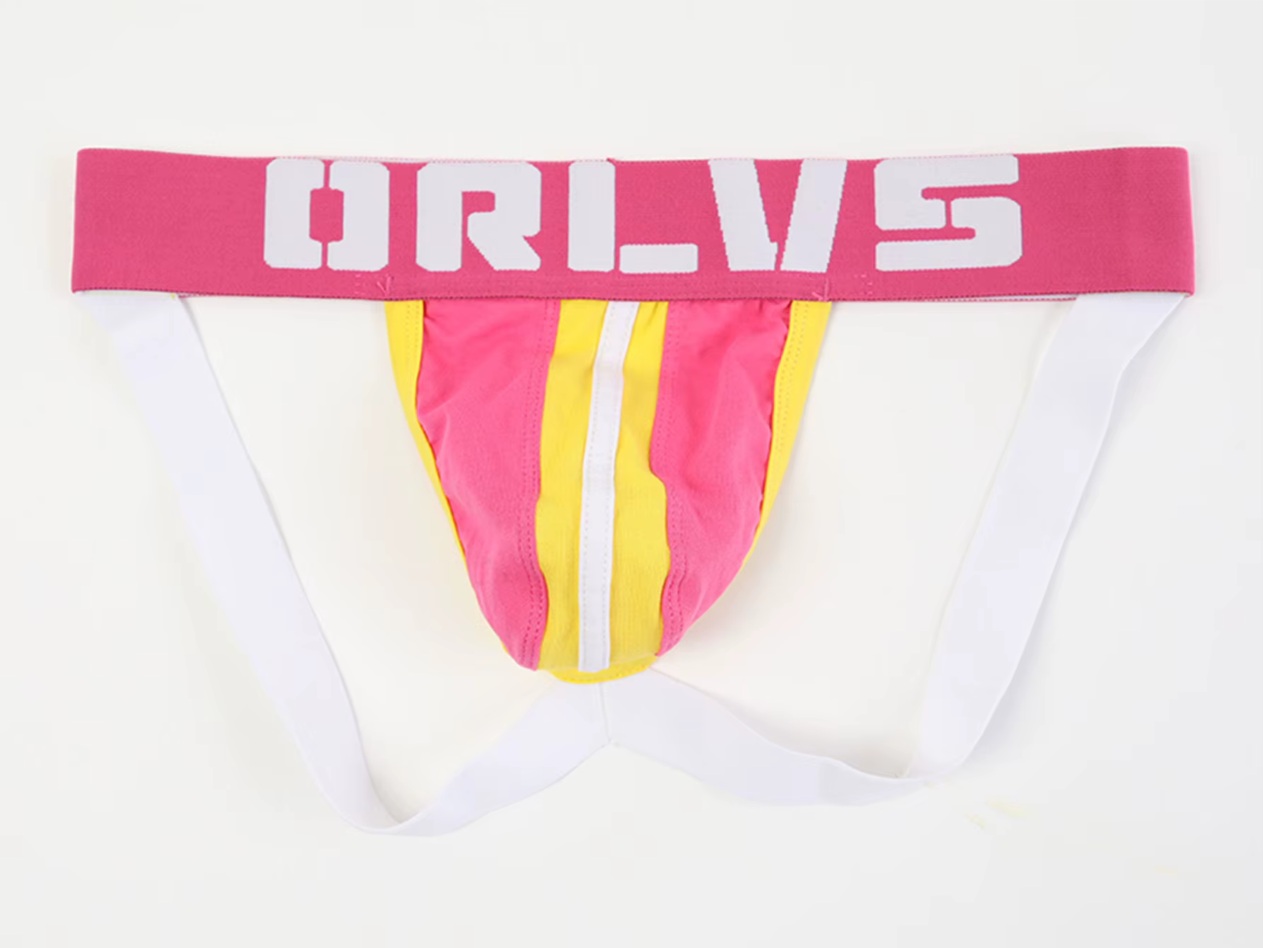Męskie jockstrapy, z elastycznym paskiem z napisem ORLVS. Trzykolorowe otwarte slipy.