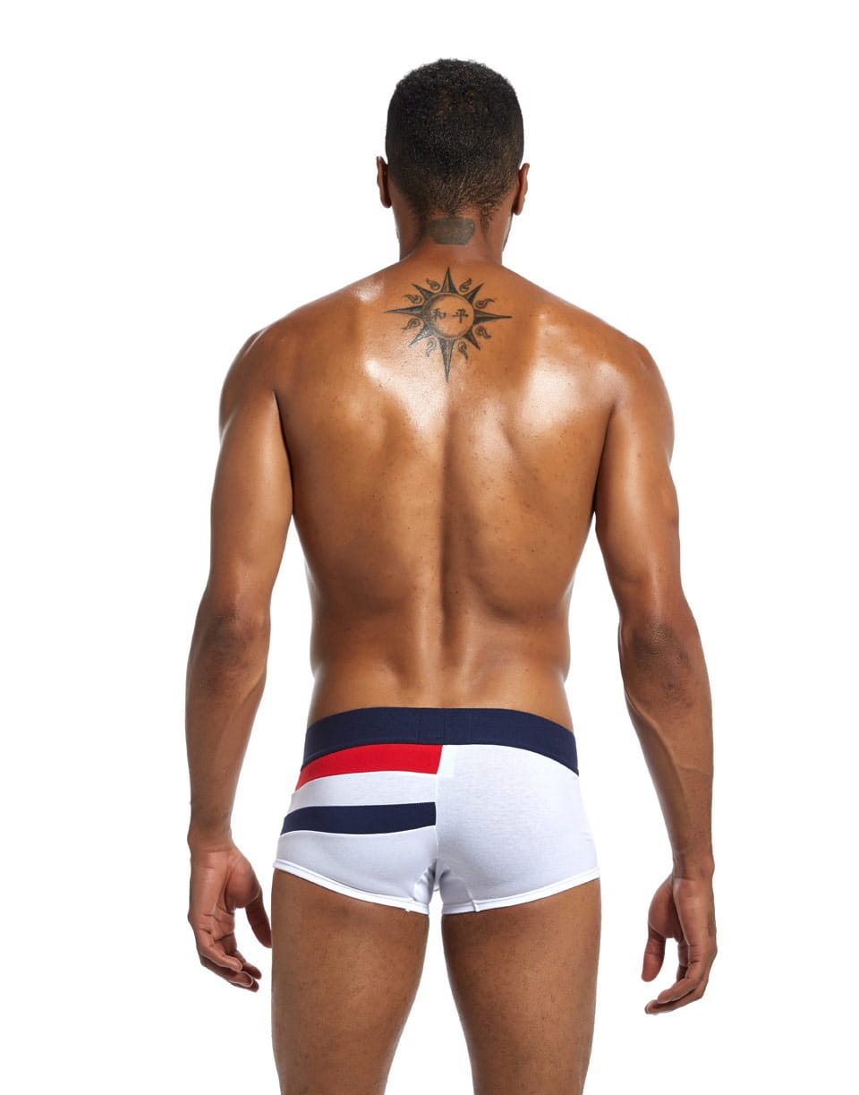 Męskie bawełniane bokserki to doskonałe połączenie klasycznego komfortu i nowoczesnego designu. Wykonane z wysokiej jakości bawełny w białym kolorze z kontrastowymi pasami w odcieniach czerwonego i granatowego, zapewniają wyjątkowy wygląd i naturalną wygodę noszenia. Klasyczna biała podstawa z charakterystycznymi kolorowymi pasami nadaje tym bokserkom sportowy, energiczny charakter, który doskonale komponuje się z aktywnym stylem życia. Naturalna bawełna najwyższej jakości została wybrana ze względu na swoje właściwości oddychające i delikatność w kontakcie ze skórą. Klasyczny krój bokserek z wygodną talią wykończoną elastyczną gumką i optymalną długością nogawek gwarantuje idealne dopasowanie i pełną swobodę ruchu.