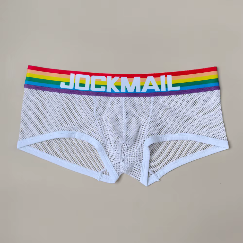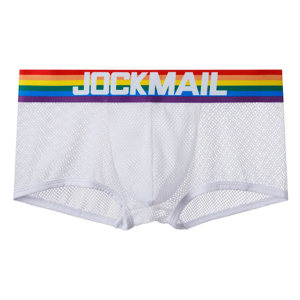 Męskie bokserki, siateczkowe. Na elastycznym, tęczowym pasie jest napis JOCKMAIL.