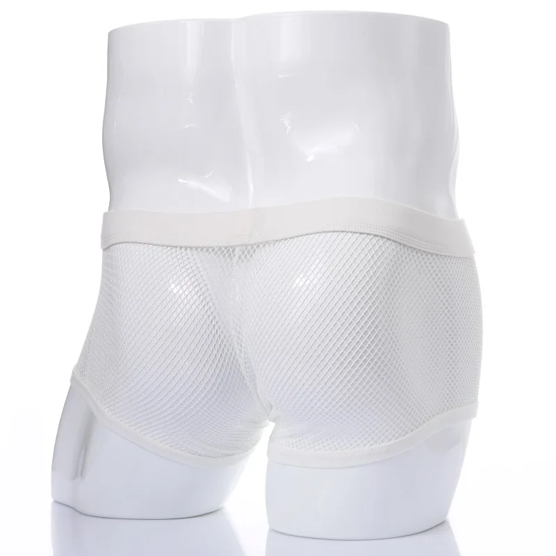 Męskie bokserki z siateczki to idealne połączenie nowoczesnego designu i maksymalnej funkcjonalności. Wykonane z elastycznej siatki w czystej bieli, zapewniają wyjątkowy wygląd i doskonałą przewiewność dla aktywnych mężczyzn. Charakterystyczna siateczka w białym kolorze nadaje tym bokserkom nowoczesny, sportowy charakter, który doskonale podkreśla męską sylwetkę. Specjalna konstrukcja siatkowa zapewnia nie tylko oryginalny wygląd, ale także doskonałą przewiewność i komfort noszenia przez cały dzień. Klasyczny krój bokserek z wygodną talią wykończoną elastyczną gumką i optymalną długością nogawek gwarantuje idealne dopasowanie i swobodę ruchu.