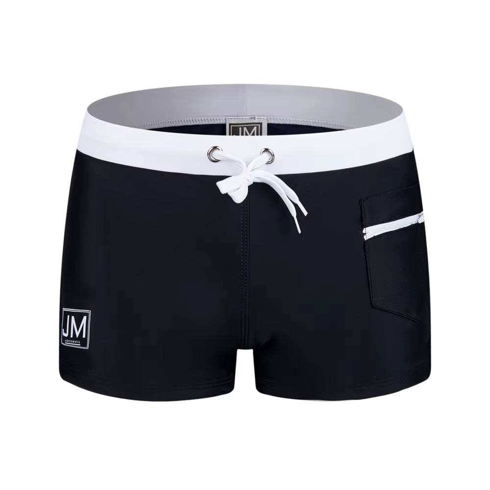Męskie kąpielówki z logo JOCKMAIL. Szorty mają biały, elastyczny pas i sznurowanie oraz małą kieszonkę zapinaną na zamek.