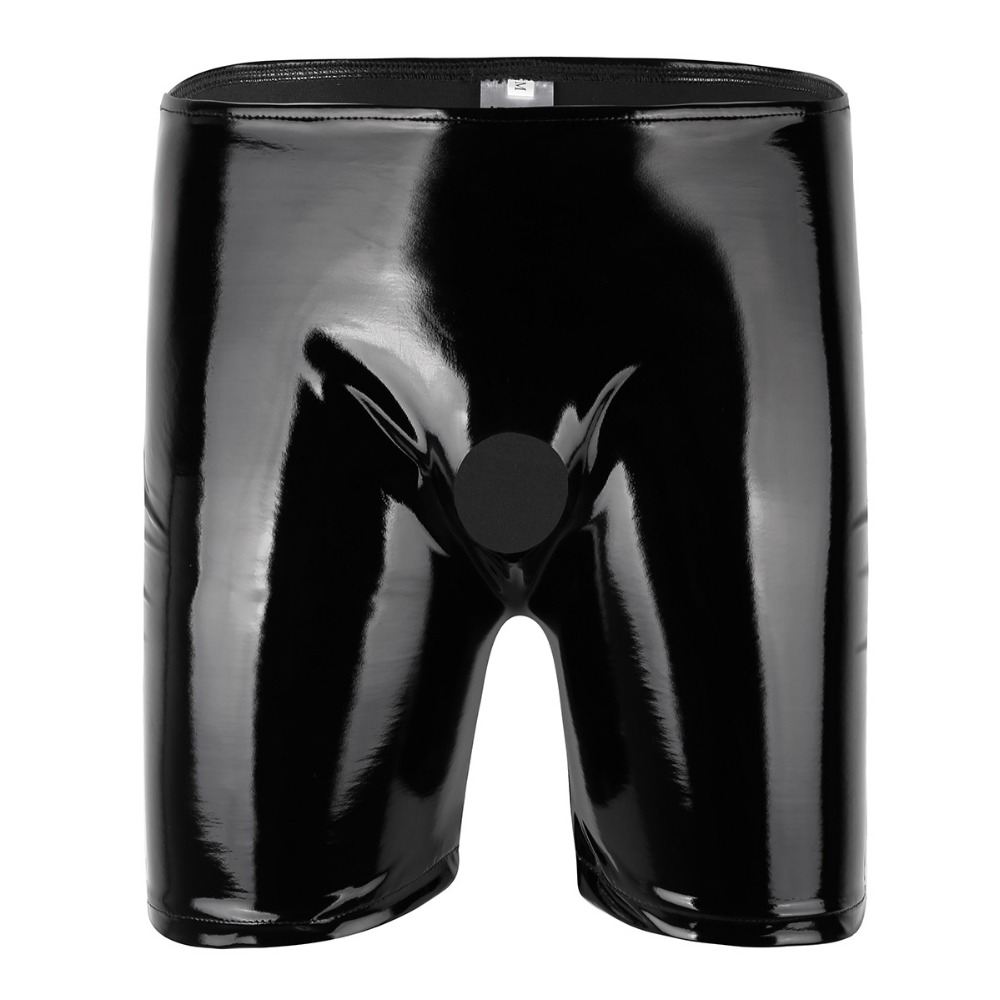 Męskie lateksowe bokserki z otworem z przodu - czarne - odważne połączenie zmysłowości i komfortu. Wykonane z miękkiego, elastycznego lateksu o błyszczącej powierzchni, z funkcjonalnym otworem z przodu.