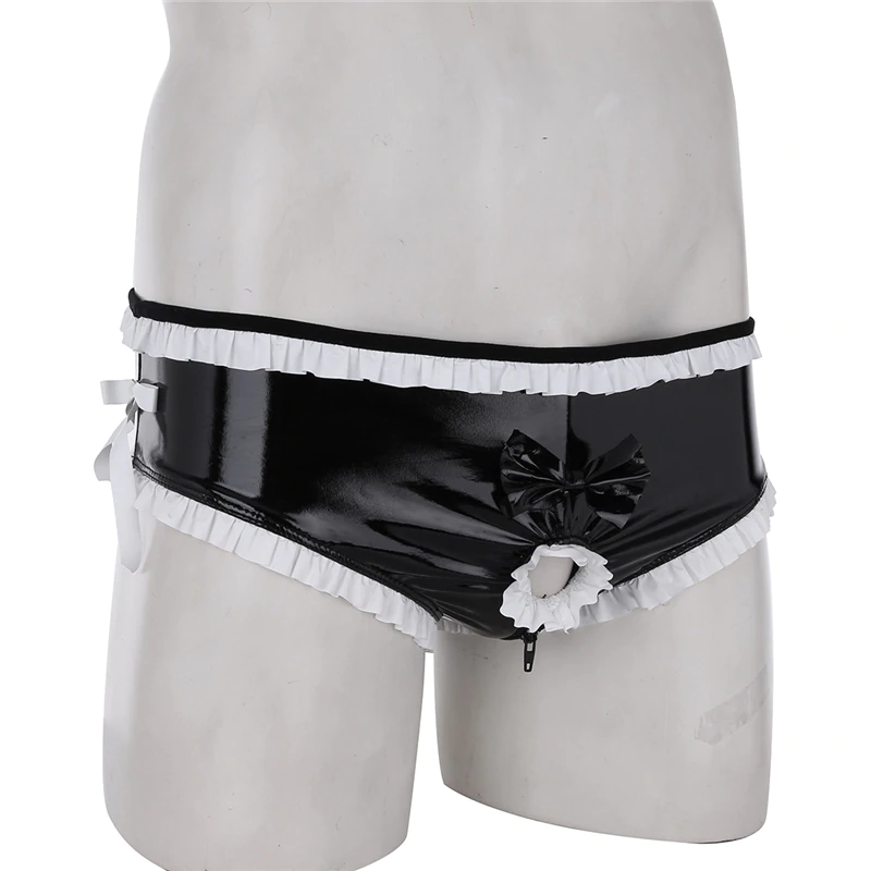 Męskie slipy, które nadają się na kostium pokojówki. Mają ozdobną kokardę i zamek.