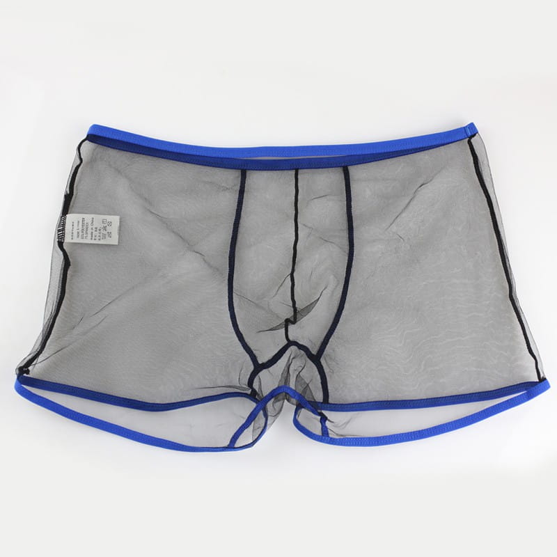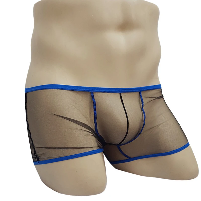 Męskie przezroczyste bokserki to nowoczesne połączenie funkcjonalności i eleganckiego designu. Wykonane z wysokiej jakości przezroczystego materiału w eleganckim czarnym kolorze z kontrastowym niebieskim wykończeniem wybranych elementów, zapewniają wyjątkową lekkość i komfort noszenia podczas codziennej aktywności. Elegancki czarny kolor w połączeniu z żywymi niebieskimi akcentami na pasie i wybranych szwach sprawiają, że te bokserki stanowią stylowy element garderoby. Wysokiej jakości przezroczysty materiał został zaprojektowany z myślą o maksymalnej lekkości i swobodzie ruchu. Wygodny krój bokserek zapewnia naturalną swobodę ruchów i komfort przez cały dzień.
