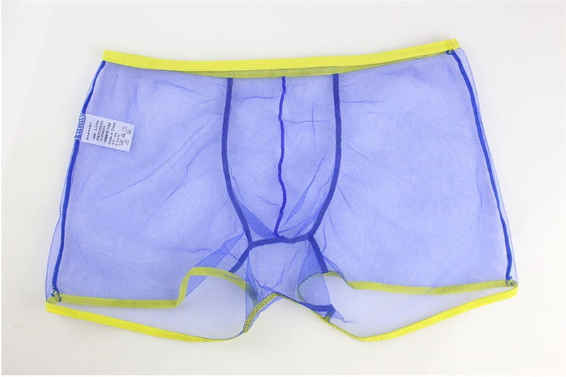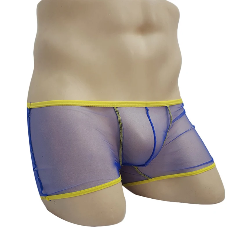 Męskie przezroczyste bokserki to nowoczesne połączenie funkcjonalności i eleganckiego designu. Wykonane z wysokiej jakości przezroczystego materiału w żywym niebieskim kolorze z kontrastowym żółtym wykończeniem wybranych elementów, zapewniają wyjątkową lekkość i komfort noszenia podczas codziennej aktywności. Żywy niebieski kolor w połączeniu z energetycznymi żółtymi akcentami na pasie i wybranych szwach sprawiają, że te bokserki stanowią stylowy element garderoby. Wysokiej jakości przezroczysty materiał został zaprojektowany z myślą o maksymalnej lekkości i swobodzie ruchu. Wygodny krój bokserek zapewnia naturalną swobodę ruchów i komfort przez cały dzień.